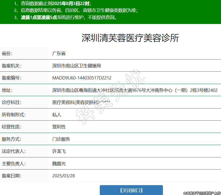 省份:廣東省備案機(jī)關(guān):深圳市南山區(qū)衛(wèi)生健康局備案編號(hào):MADD9U60-144030517D2212地址:深圳市南山區(qū)粵海街道大沖社區(qū)深南大道9676號(hào)大沖商務(wù)中心(一期)2棟3號(hào)樓2402診療科目:醫(yī)療美容科(美容皮膚科)******所有制形式:私人經(jīng)營(yíng)性質(zhì):營(yíng)利性服務(wù)方式:門(mén)診服務(wù)法定代表人:許龍飛主要負(fù)責(zé)人:魏晨光備案日期:2025/03/28 -
