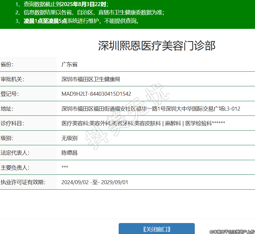 省份:廣東省審批機(jī)關(guān):深圳市福田區(qū)衛(wèi)生健康局登記號(hào):MAD9H2LT-844030415D1542地址:深圳市福田區(qū)福田街道福安社區(qū)福華一路1號(hào)深圳大中華國(guó)際交易廣場(chǎng)L3-012診療科目:醫(yī)療美容科;美容外科;美容牙科;美容皮膚科 | 麻醉科 | 醫(yī)學(xué)檢驗(yàn)科******級(jí)別:無(wú)級(jí)別法定代表人:陳德昌主要負(fù)責(zé)人:***執(zhí)業(yè)許可證有效期:2024/09/02 -至- 2029/09/01 -