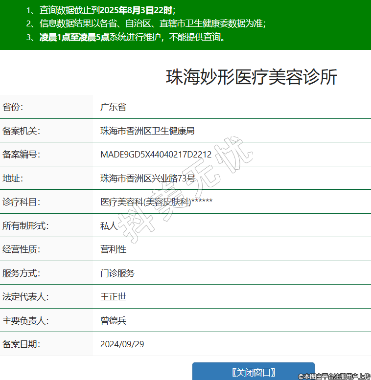省份:廣東省備案機關:珠海市香洲區(qū)衛(wèi)生健康局備案編號:MADE9GD5X44040217D2212地址:珠海市香洲區(qū)興業(yè)路73號診療科目:醫(yī)療美容科(美容皮膚科)******所有制形式:私人經(jīng)營性質(zhì):營利性服務方式:門診服務法定代表人:王正世主要負責人:曾德兵備案日期:2024/09/29 -