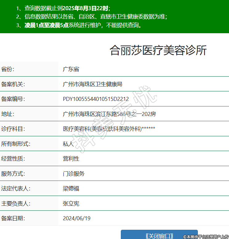 省份:廣東省備案機(jī)關(guān):廣州市海珠區(qū)衛(wèi)生健康局備案編號(hào):PDY10055544010515D2212地址:廣州市海珠區(qū)濱江東路586號(hào)之一202房診療科目:醫(yī)療美容科(美容皮膚科美容外科)******所有制形式:私人經(jīng)營(yíng)性質(zhì):營(yíng)利性服務(wù)方式:門(mén)診服務(wù)法定代表人:梁德福主要負(fù)責(zé)人:張立憲備案日期:2024/06/19 -