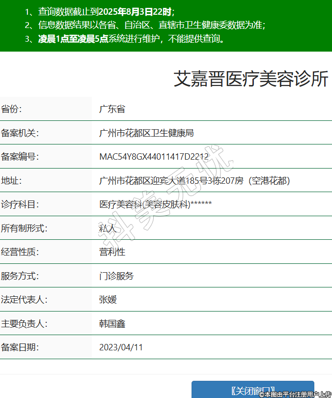省份:廣東省備案機(jī)關(guān):廣州市花都區(qū)衛(wèi)生健康局備案編號(hào):MAC54Y8GX44011417D2212地址:廣州市花都區(qū)迎賓大道185號(hào)3棟207房(空港花都)診療科目:醫(yī)療美容科(美容皮膚科)******所有制形式:私人經(jīng)營(yíng)性質(zhì):營(yíng)利性服務(wù)方式:門診服務(wù)法定代表人:張嬡主要負(fù)責(zé)人:韓國(guó)鑫備案日期:2023/04/11 -