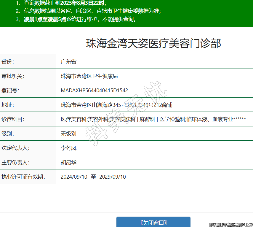 省份:廣東省審批機關(guān):珠海市金灣區(qū)衛(wèi)生健康局登記號:MADAXHP5644040415D1542地址:珠海市金灣區(qū)山湖海路345號3#2層349號212商鋪診療科目:醫(yī)療美容科;美容外科;美容皮膚科 | 麻醉科 | 醫(yī)學(xué)檢驗科;臨床體液、血液專業(yè)******級別:無級別法定代表人:李冬鳳主要負(fù)責(zé)人:胡昂華執(zhí)業(yè)許可證有效期:2024/09/10 -至- 2029/09/10 -