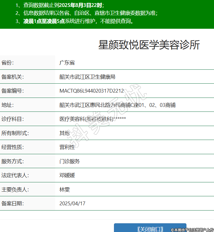 省份:廣東省備案機關(guān):韶關(guān)市武江區(qū)衛(wèi)生健康局備案編號:MACTQ86L944020317D2212地址:韶關(guān)市武江區(qū)惠民北路為民商鋪C座01、02、03商鋪診療科目:醫(yī)療美容科(美容皮膚科)******所有制形式:其他經(jīng)營性質(zhì):營利性服務方式:門診服務法定代表人:鄧媛媛主要負責人:林雯備案日期:2025/04/17 -