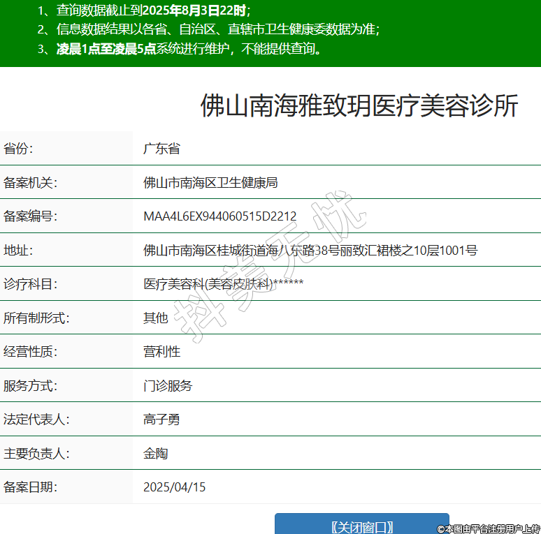 省份:廣東省備案機關(guān):佛山市南海區(qū)衛(wèi)生健康局備案編號:MAA4L6EX944060515D2212地址:佛山市南海區(qū)桂城街道海八東路38號麗致匯裙樓之10層1001號診療科目:醫(yī)療美容科(美容皮膚科)******所有制形式:其他經(jīng)營性質(zhì):營利性服務(wù)方式:門診服務(wù)法定代表人:高子勇主要負責(zé)人:金陶備案日期:2025/04/15 -