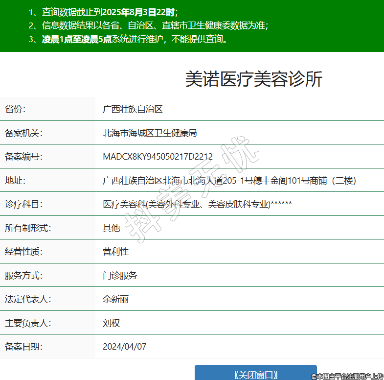 省份:廣西壯族自治區(qū)備案機(jī)關(guān):北海市海城區(qū)衛(wèi)生健康局備案編號(hào):MADCX8KY945050217D2212地址:廣西壯族自治區(qū)北海市北海大道205-1號(hào)穗豐金閣101號(hào)商鋪(二樓)診療科目:醫(yī)療美容科(美容外科專(zhuān)業(yè)、美容皮膚科專(zhuān)業(yè))******所有制形式:其他經(jīng)營(yíng)性質(zhì):營(yíng)利性服務(wù)方式:門(mén)診服務(wù)法定代表人:余新麗主要負(fù)責(zé)人:劉權(quán)備案日期:2024/04/07 -