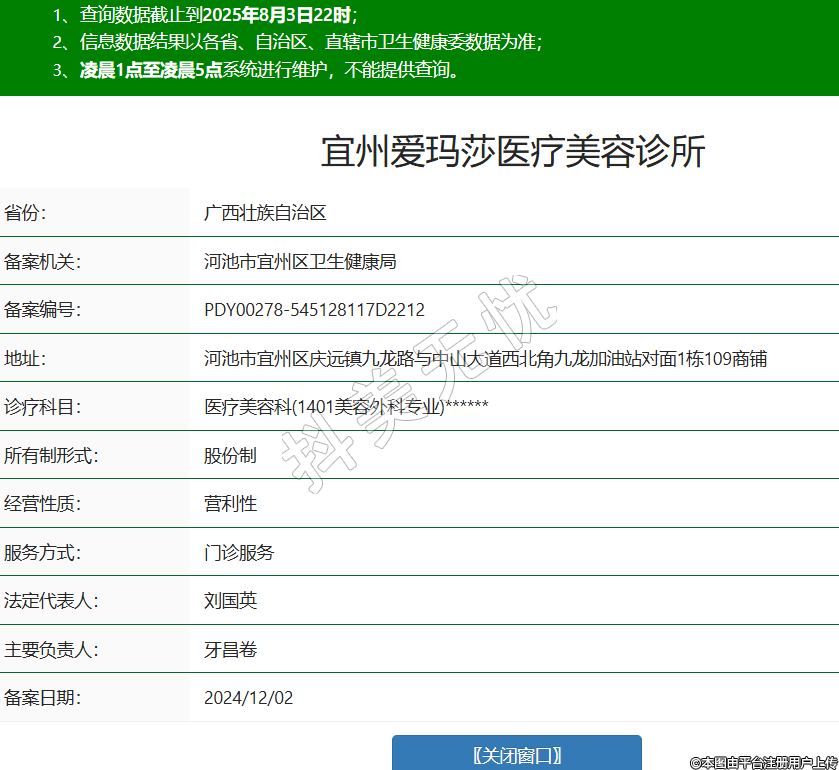 省份:廣西壯族自治區(qū)備案機(jī)關(guān):河池市宜州區(qū)衛(wèi)生健康局備案編號(hào):PDY00278-545128117D2212地址:河池市宜州區(qū)慶遠(yuǎn)鎮(zhèn)九龍路與中山大道西北角九龍加油站對(duì)面1棟109商鋪診療科目:醫(yī)療美容科(1401美容外科專業(yè))******所有制形式:股份制經(jīng)營(yíng)性質(zhì):營(yíng)利性服務(wù)方式:門(mén)診服務(wù)法定代表人:劉國(guó)英主要負(fù)責(zé)人:牙昌卷備案日期:2024/12/02 -