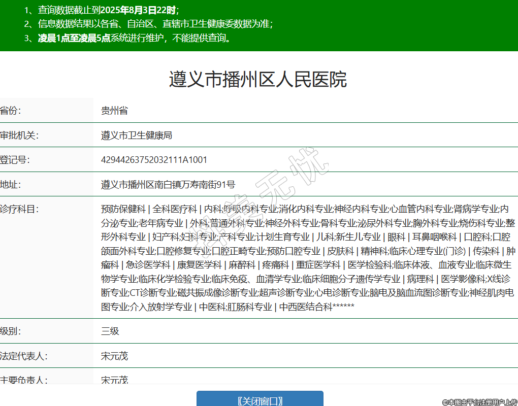省份:貴州省審批機關:遵義市衛(wèi)生健康局登記號:42944263752032111A1001地址:遵義市播州區(qū)南白鎮(zhèn)萬壽南街91號診療科目:預防保健科 | 全科醫(yī)療科 | 內科;呼吸內科專業(yè);消化內科專業(yè);神經(jīng)內科專業(yè);心血管內科專業(yè);腎病學專業(yè);內分泌專業(yè);老年病專業(yè) | 外科;普通外科專業(yè);神經(jīng)外科專業(yè);骨科專業(yè);泌尿外科專業(yè);胸外科專業(yè);燒傷科專業(yè);整形外科專業(yè) | 婦產科;婦科專業(yè);產科專業(yè);計劃生育專業(yè) | 兒科;新生兒專業(yè) | 眼科 | 耳鼻咽喉科 | 口腔科;口腔頜面外科專業(yè);口腔修復專業(yè);口腔正畸專業(yè);預防口腔專業(yè) | 皮膚科 | 精神科;臨床心理專業(yè)(門診) | 傳染科 | 腫瘤科 | 急診醫(yī)學科 | 康復醫(yī)學科 | 麻醉科 | 疼痛科 | 重癥醫(yī)學科 | 醫(yī)學檢驗科;臨床體液、血液專業(yè);臨床微生物學專業(yè);臨床化學檢驗專業(yè);臨床免疫、血清學專業(yè);臨床細胞分子遺傳學專業(yè) | 病理科 | 醫(yī)學影像科;X線診斷專業(yè);CT診斷專業(yè);磁共振成像診斷專業(yè);超聲診斷專業(yè);心電診斷專業(yè);腦電及腦血流圖診斷專業(yè);神經(jīng)肌肉電圖專業(yè);介入放射學專業(yè) | 中醫(yī)科;肛腸科專業(yè) | 中西醫(yī)結合科******級別:三級法定代表人:宋元茂主要負責人:宋元茂執(zhí)業(yè)許可證有效期:2025/02/01 -至- 2040/01/31 -