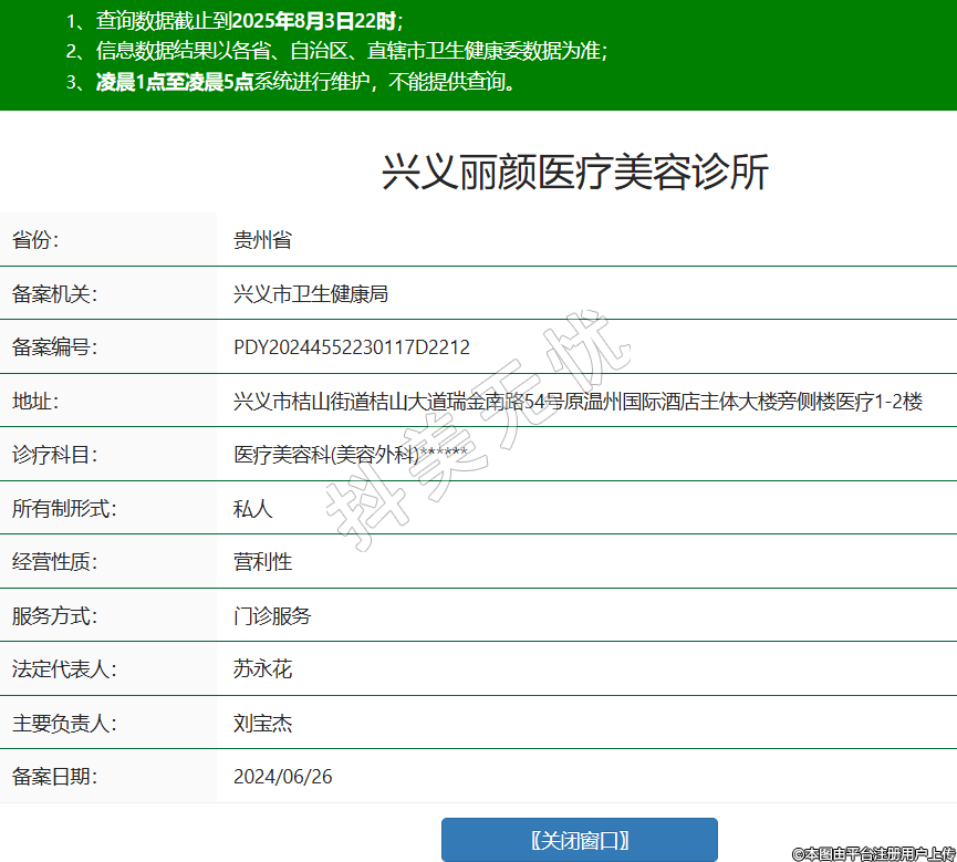 省份:貴州省備案機(jī)關(guān):興義市衛(wèi)生健康局備案編號(hào):PDY20244552230117D2212地址:興義市桔山街道桔山大道瑞金南路54號(hào)原溫州國際酒店主體大樓旁側(cè)樓醫(yī)療1-2樓診療科目:醫(yī)療美容科(美容外科)******所有制形式:私人經(jīng)營(yíng)性質(zhì):營(yíng)利性服務(wù)方式:門診服務(wù)法定代表人:蘇永花主要負(fù)責(zé)人:劉寶杰備案日期:2024/06/26 -