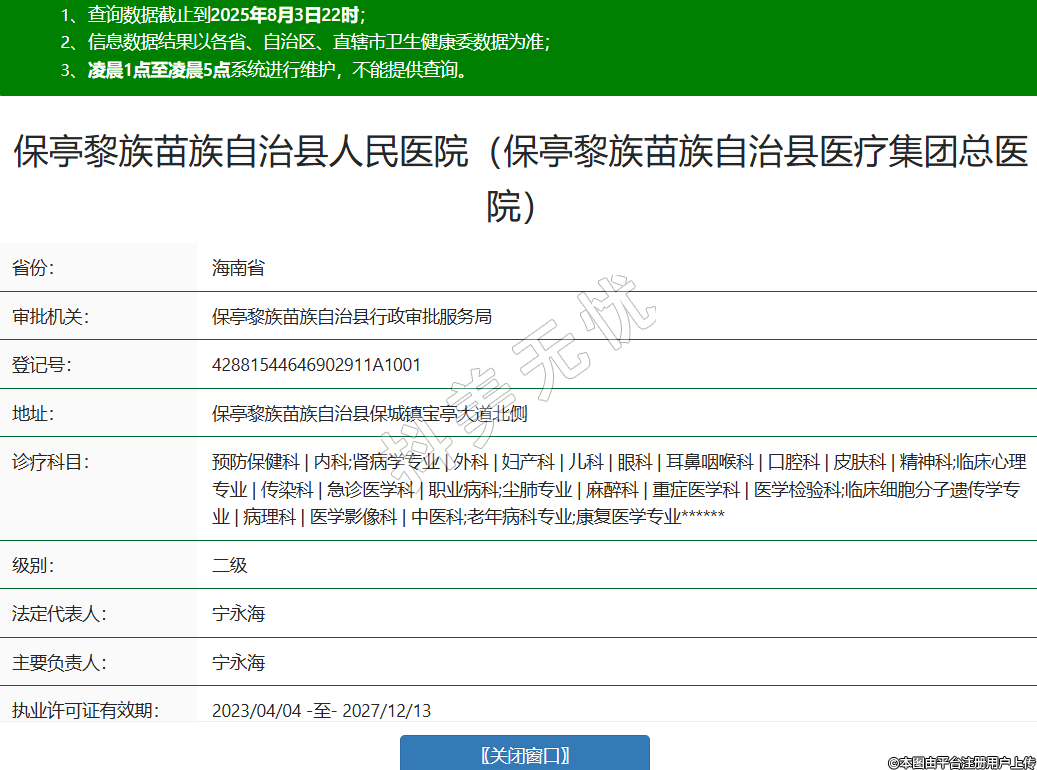 省份:海南省審批機(jī)關(guān):保亭黎族苗族自治縣行政審批服務(wù)局登記號(hào):42881544646902911A1001地址:保亭黎族苗族自治縣保城鎮(zhèn)寶亭大道北側(cè)診療科目:預(yù)防保健科 | 內(nèi)科;腎病學(xué)專(zhuān)業(yè) | 外科 | 婦產(chǎn)科 | 兒科 | 眼科 | 耳鼻咽喉科 | 口腔科 | 皮膚科 | 精神科;臨床心理專(zhuān)業(yè) | 傳染科 | 急診醫(yī)學(xué)科 | 職業(yè)病科;塵肺專(zhuān)業(yè) | 麻醉科 | 重癥醫(yī)學(xué)科 | 醫(yī)學(xué)檢驗(yàn)科;臨床細(xì)胞分子遺傳學(xué)專(zhuān)業(yè) | 病理科 | 醫(yī)學(xué)影像科 | 中醫(yī)科;老年病科專(zhuān)業(yè);康復(fù)醫(yī)學(xué)專(zhuān)業(yè)******級(jí)別:二級(jí)法定代表人:寧永海主要負(fù)責(zé)人:寧永海執(zhí)業(yè)許可證有效期:2023/04/04 -至- 2027/12/13 -