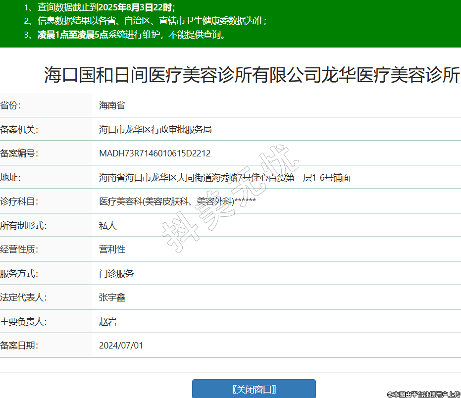 省份:海南省備案機(jī)關(guān):??谑旋埲A區(qū)行政審批服務(wù)局備案編號(hào):MADH73R7146010615D2212地址:海南省??谑旋埲A區(qū)大同街道海秀路7號(hào)佳心百貨第一層1-6號(hào)鋪面診療科目:醫(yī)療美容科(美容皮膚科、美容外科)******所有制形式:私人經(jīng)營性質(zhì):營利性服務(wù)方式:門診服務(wù)法定代表人:張宇鑫主要負(fù)責(zé)人:趙巖備案日期:2024/07/01 -
