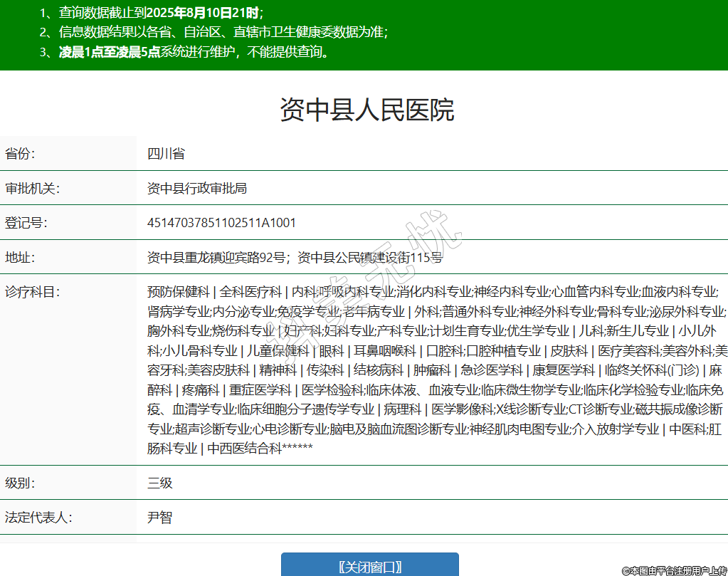 省份:四川省審批機關:資中縣行政審批局登記號:45147037851102511A1001地址:資中縣重龍鎮(zhèn)迎賓路92號;資中縣公民鎮(zhèn)建設街115號診療科目:預防保健科 | 全科醫(yī)療科 | 內科;呼吸內科專業(yè);消化內科專業(yè);神經內科專業(yè);心血管內科專業(yè);血液內科專業(yè);腎病學專業(yè);內分泌專業(yè);免疫學專業(yè);老年病專業(yè) | 外科;普通外科專業(yè);神經外科專業(yè);骨科專業(yè);泌尿外科專業(yè);胸外科專業(yè);燒傷科專業(yè) | 婦產科;婦科專業(yè);產科專業(yè);計劃生育專業(yè);優(yōu)生學專業(yè) | 兒科;新生兒專業(yè) | 小兒外科;小兒骨科專業(yè) | 兒童保健科 | 眼科 | 耳鼻咽喉科 | 口腔科;口腔種植專業(yè) | 皮膚科 | 醫(yī)療美容科;美容外科;美容牙科;美容皮膚科 | 精神科 | 傳染科 | 結核病科 | 腫瘤科 | 急診醫(yī)學科 | 康復醫(yī)學科 | 臨終關懷科(門診) | 麻醉科 | 疼痛科 | 重癥醫(yī)學科 | 醫(yī)學檢驗科;臨床體液、血液專業(yè);臨床微生物學專業(yè);臨床化學檢驗專業(yè);臨床免疫、血清學專業(yè);臨床細胞分子遺傳學專業(yè) | 病理科 | 醫(yī)學影像科;X線診斷專業(yè);CT診斷專業(yè);磁共振成像診斷專業(yè);超聲診斷專業(yè);心電診斷專業(yè);腦電及腦血流圖診斷專業(yè);神經肌肉電圖專業(yè);介入放射學專業(yè) | 中醫(yī)科;肛腸科專業(yè) | 中西醫(yī)結合科******級別:三級法定代表人:尹智主要負責人:尹智執(zhí)業(yè)許可證有效期:2025/07/28 -至- 2030/12/31 -
