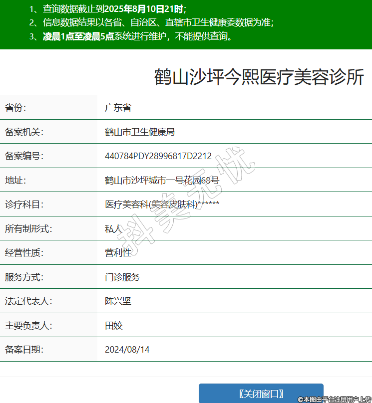 省份:廣東省備案機(jī)關(guān):鶴山市衛(wèi)生健康局備案編號:440784PDY28996817D2212地址:鶴山市沙坪城市一號花園68號診療科目:醫(yī)療美容科(美容皮膚科)******所有制形式:私人經(jīng)營性質(zhì):營利性服務(wù)方式:門診服務(wù)法定代表人:陳興堅主要負(fù)責(zé)人:田姣備案日期:2024/08/14 -