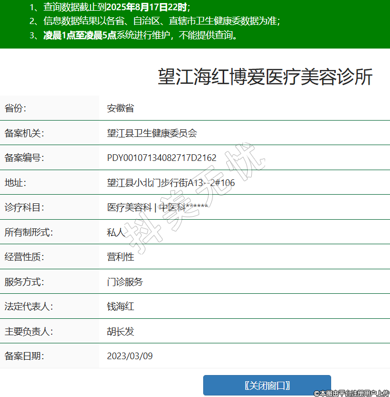 省份:安徽省備案機關(guān):望江縣衛(wèi)生健康委員會備案編號:PDY00107134082717D2162地址:望江縣小北門步行街A13--2#106診療科目:醫(yī)療美容科 | 中醫(yī)科******所有制形式:私人經(jīng)營性質(zhì):營利性服務(wù)方式:門診服務(wù)法定代表人:錢海紅主要負(fù)責(zé)人:胡長發(fā)備案日期:2023/03/09 -