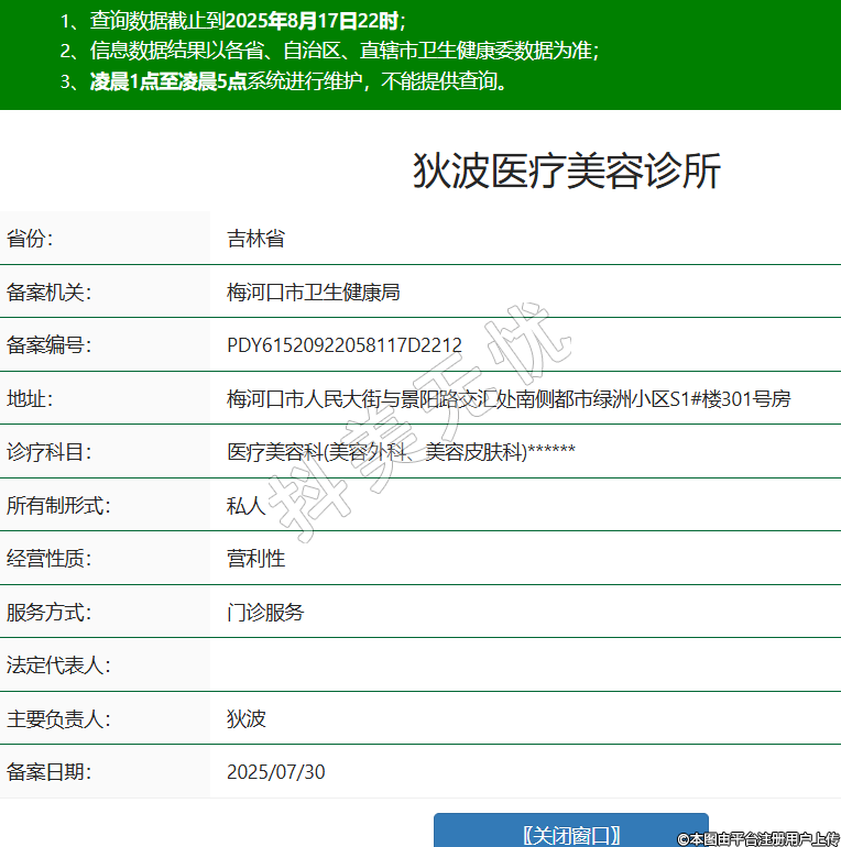 省份:吉林省備案機(jī)關(guān):梅河口市衛(wèi)生健康局備案編號(hào):PDY61520922058117D2212地址:梅河口市人民大街與景陽路交匯處南側(cè)都市綠洲小區(qū)S1#樓301號(hào)房診療科目:醫(yī)療美容科(美容外科、美容皮膚科)******所有制形式:私人經(jīng)營性質(zhì):營利性服務(wù)方式:門診服務(wù)法定代表人:主要負(fù)責(zé)人:狄波備案日期:2025/07/30 -