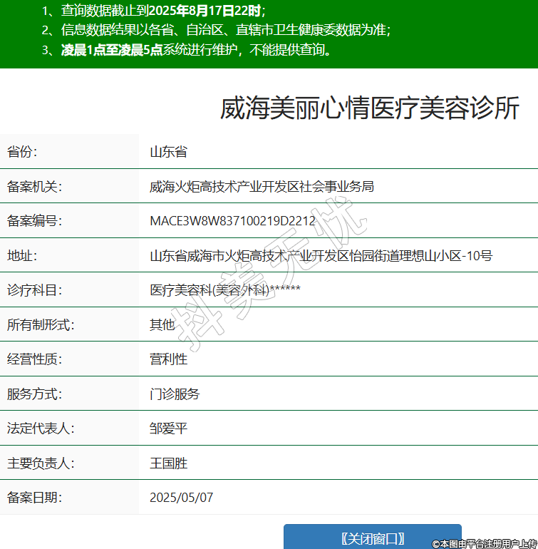 省份:山東省備案機(jī)關(guān):威?;鹁娓呒夹g(shù)產(chǎn)業(yè)開(kāi)發(fā)區(qū)社會(huì)事業(yè)務(wù)局備案編號(hào):MACE3W8W837100219D2212地址:山東省威海市火炬高技術(shù)產(chǎn)業(yè)開(kāi)發(fā)區(qū)怡園街道理想山小區(qū)-10號(hào)診療科目:醫(yī)療美容科(美容外科)******所有制形式:其他經(jīng)營(yíng)性質(zhì):營(yíng)利性服務(wù)方式:門(mén)診服務(wù)法定代表人:鄒愛(ài)平主要負(fù)責(zé)人:王國(guó)勝備案日期:2025/05/07 -