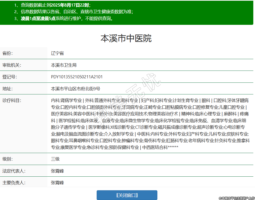 省份:遼寧省審批機(jī)關(guān):本溪市衛(wèi)生局登記號:PDY10135521050211A2101地址:本溪市平山區(qū)市府北街9號診療科目:內(nèi)科;腎病學(xué)專業(yè) | 外科;普通外科專業(yè);骨科專業(yè) | 婦產(chǎn)科;婦科專業(yè);計(jì)劃生育專業(yè) | 眼科 | 口腔科;牙體牙髓病專業(yè);口腔內(nèi)科專業(yè);口腔頜面外科專業(yè);牙周病專業(yè);正畸專業(yè);口腔粘膜病專業(yè);口腔修復(fù)專業(yè);兒童口腔專業(yè) | 醫(yī)療美容科;美容中醫(yī)科;中藥外治;美容醫(yī)療應(yīng)用技術(shù);物理美容治療術(shù) | 精神科;臨床心理專業(yè) | 麻醉科 | 疼痛科 | 醫(yī)學(xué)檢驗(yàn)科;臨床體液、血液專業(yè);臨床微生物學(xué)專業(yè);臨床化學(xué)檢驗(yàn)專業(yè);臨床免疫、血清學(xué)專業(yè);臨床細(xì)胞分子遺傳學(xué)專業(yè) | 醫(yī)學(xué)影像科;X線診斷專業(yè);CT診斷專業(yè);磁共振成像診斷專業(yè);超聲診斷專業(yè);心電診斷專業(yè);腦電及腦血流圖診斷專業(yè);介入放射學(xué)專業(yè) | 中醫(yī)科;內(nèi)科專業(yè);外科專業(yè);婦產(chǎn)科專業(yè);兒科專業(yè);皮膚科專業(yè);眼科專業(yè);耳鼻咽喉科專業(yè);口腔科專業(yè);腫瘤科專業(yè);骨傷科專業(yè);肛腸科專業(yè);老年病科專業(yè);針灸科專業(yè);推拿科專業(yè);康復(fù)醫(yī)學(xué)專業(yè);急診科專業(yè);預(yù)防保健科專業(yè) | 中西醫(yī)結(jié)合科******級別:三級法定代表人:張霄峰主要負(fù)責(zé)人:張霄峰執(zhí)業(yè)許可證有效期:2012/03/30 -至- 2027/03/30 -