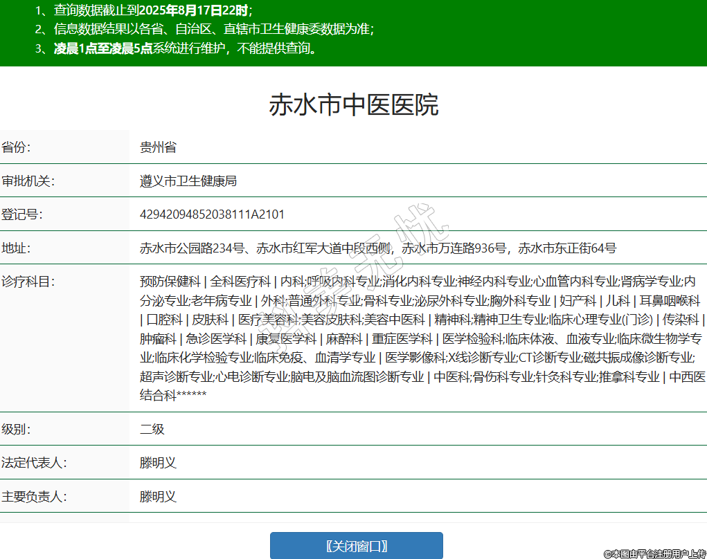 省份:貴州省審批機(jī)關(guān):遵義市衛(wèi)生健康局登記號(hào):42942094852038111A2101地址:赤水市公園路234號(hào)、赤水市紅軍大道中段西側(cè),赤水市萬連路936號(hào),赤水市東正街64號(hào)診療科目:預(yù)防保健科 | 全科醫(yī)療科 | 內(nèi)科;呼吸內(nèi)科專業(yè);消化內(nèi)科專業(yè);神經(jīng)內(nèi)科專業(yè);心血管內(nèi)科專業(yè);腎病學(xué)專業(yè);內(nèi)分泌專業(yè);老年病專業(yè) | 外科;普通外科專業(yè);骨科專業(yè);泌尿外科專業(yè);胸外科專業(yè) | 婦產(chǎn)科 | 兒科 | 耳鼻咽喉科 | 口腔科 | 皮膚科 | 醫(yī)療美容科;美容皮膚科;美容中醫(yī)科 | 精神科;精神衛(wèi)生專業(yè);臨床心理專業(yè)(門診) | 傳染科 | 腫瘤科 | 急診醫(yī)學(xué)科 | 康復(fù)醫(yī)學(xué)科 | 麻醉科 | 重癥醫(yī)學(xué)科 | 醫(yī)學(xué)檢驗(yàn)科;臨床體液、血液專業(yè);臨床微生物學(xué)專業(yè);臨床化學(xué)檢驗(yàn)專業(yè);臨床免疫、血清學(xué)專業(yè) | 醫(yī)學(xué)影像科;X線診斷專業(yè);CT診斷專業(yè);磁共振成像診斷專業(yè);超聲診斷專業(yè);心電診斷專業(yè);腦電及腦血流圖診斷專業(yè) | 中醫(yī)科;骨傷科專業(yè);針灸科專業(yè);推拿科專業(yè) | 中西醫(yī)結(jié)合科******級(jí)別:二級(jí)法定代表人:滕明義主要負(fù)責(zé)人:滕明義執(zhí)業(yè)許可證有效期:2014/05/01 -至- 2029/04/30 -