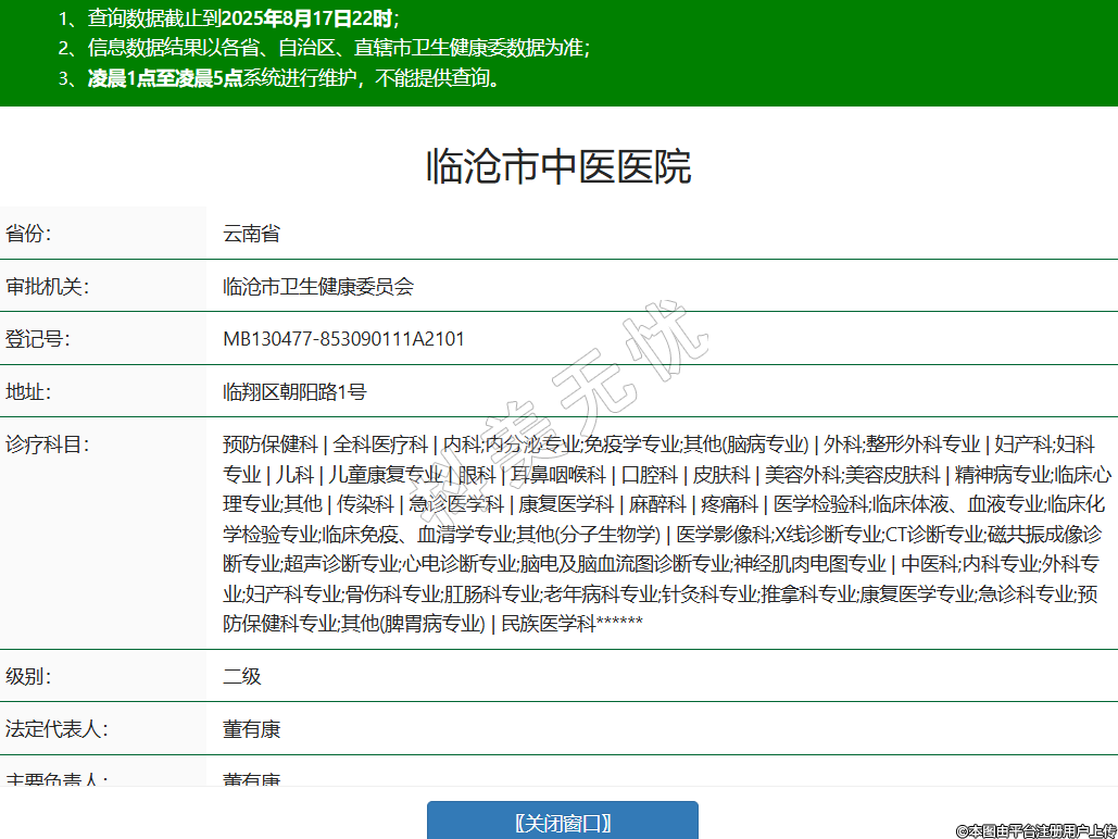 省份:云南省審批機(jī)關(guān):臨滄市衛(wèi)生健康委員會(huì)登記號(hào):MB130477-853090111A2101地址:臨翔區(qū)朝陽(yáng)路1號(hào)診療科目:預(yù)防保健科 | 全科醫(yī)療科 | 內(nèi)科;內(nèi)分泌專業(yè);免疫學(xué)專業(yè);其他(腦病專業(yè)) | 外科;整形外科專業(yè) | 婦產(chǎn)科;婦科專業(yè) | 兒科 | 兒童康復(fù)專業(yè) | 眼科 | 耳鼻咽喉科 | 口腔科 | 皮膚科 | 美容外科;美容皮膚科 | 精神病專業(yè);臨床心理專業(yè);其他 | 傳染科 | 急診醫(yī)學(xué)科 | 康復(fù)醫(yī)學(xué)科 | 麻醉科 | 疼痛科 | 醫(yī)學(xué)檢驗(yàn)科;臨床體液、血液專業(yè);臨床化學(xué)檢驗(yàn)專業(yè);臨床免疫、血清學(xué)專業(yè);其他(分子生物學(xué)) | 醫(yī)學(xué)影像科;X線診斷專業(yè);CT診斷專業(yè);磁共振成像診斷專業(yè);超聲診斷專業(yè);心電診斷專業(yè);腦電及腦血流圖診斷專業(yè);神經(jīng)肌肉電圖專業(yè) | 中醫(yī)科;內(nèi)科專業(yè);外科專業(yè);婦產(chǎn)科專業(yè);骨傷科專業(yè);肛腸科專業(yè);老年病科專業(yè);針灸科專業(yè);推拿科專業(yè);康復(fù)醫(yī)學(xué)專業(yè);急診科專業(yè);預(yù)防保健科專業(yè);其他(脾胃病專業(yè)) | 民族醫(yī)學(xué)科******級(jí)別:二級(jí)法定代表人:董有康主要負(fù)責(zé)人:董有康執(zhí)業(yè)許可證有效期:2025/06/09 -至- 2034/09/12 -