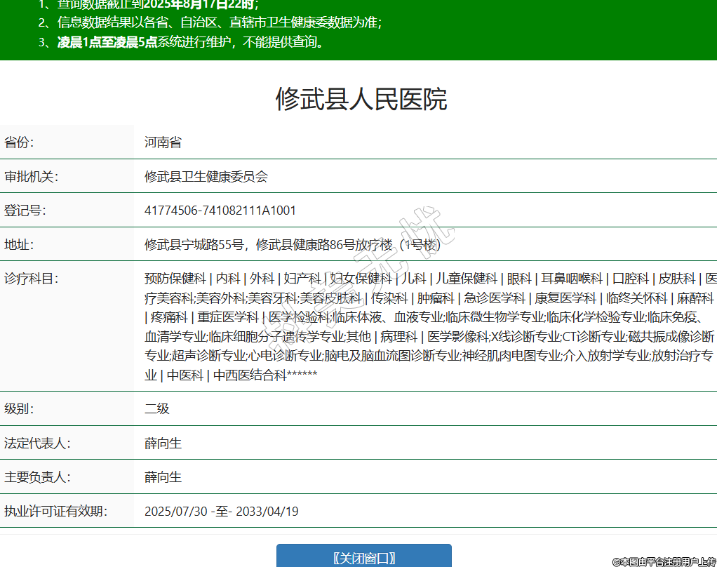 省份:河南省審批機(jī)關(guān):修武縣衛(wèi)生健康委員會登記號:41774506-741082111A1001地址:修武縣寧城路55號,修武縣健康路86號放療樓(1號樓)診療科目:預(yù)防保健科 | 內(nèi)科 | 外科 | 婦產(chǎn)科 | 婦女保健科 | 兒科 | 兒童保健科 | 眼科 | 耳鼻咽喉科 | 口腔科 | 皮膚科 | 醫(yī)療美容科;美容外科;美容牙科;美容皮膚科 | 傳染科 | 腫瘤科 | 急診醫(yī)學(xué)科 | 康復(fù)醫(yī)學(xué)科 | 臨終關(guān)懷科 | 麻醉科 | 疼痛科 | 重癥醫(yī)學(xué)科 | 醫(yī)學(xué)檢驗(yàn)科;臨床體液、血液專業(yè);臨床微生物學(xué)專業(yè);臨床化學(xué)檢驗(yàn)專業(yè);臨床免疫、血清學(xué)專業(yè);臨床細(xì)胞分子遺傳學(xué)專業(yè);其他 | 病理科 | 醫(yī)學(xué)影像科;X線診斷專業(yè);CT診斷專業(yè);磁共振成像診斷專業(yè);超聲診斷專業(yè);心電診斷專業(yè);腦電及腦血流圖診斷專業(yè);神經(jīng)肌肉電圖專業(yè);介入放射學(xué)專業(yè);放射治療專業(yè) | 中醫(yī)科 | 中西醫(yī)結(jié)合科******級別:二級法定代表人:薛向生主要負(fù)責(zé)人:薛向生執(zhí)業(yè)許可證有效期:2025/07/30 -至- 2033/04/19 -