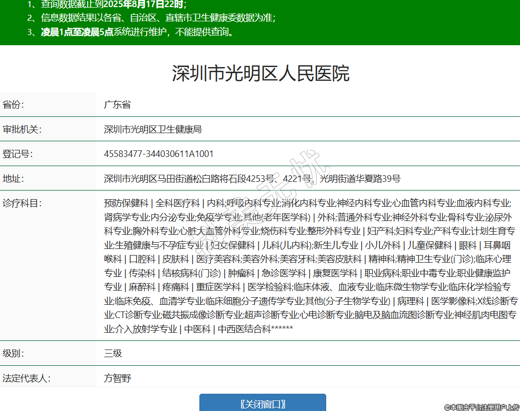 省份:廣東省審批機(jī)關(guān):深圳市光明區(qū)衛(wèi)生健康局登記號(hào):45583477-344030611A1001地址:深圳市光明區(qū)馬田街道松白路將石段4253號(hào)、4221號(hào),光明街道華夏路39號(hào)診療科目:預(yù)防保健科 | 全科醫(yī)療科 | 內(nèi)科;呼吸內(nèi)科專業(yè);消化內(nèi)科專業(yè);神經(jīng)內(nèi)科專業(yè);心血管內(nèi)科專業(yè);血液內(nèi)科專業(yè);腎病學(xué)專業(yè);內(nèi)分泌專業(yè);免疫學(xué)專業(yè);其他(老年醫(yī)學(xué)科) | 外科;普通外科專業(yè);神經(jīng)外科專業(yè);骨科專業(yè);泌尿外科專業(yè);胸外科專業(yè);心臟大血管外科專業(yè);燒傷科專業(yè);整形外科專業(yè) | 婦產(chǎn)科;婦科專業(yè);產(chǎn)科專業(yè);計(jì)劃生育專業(yè);生殖健康與不孕癥專業(yè) | 婦女保健科 | 兒科(兒內(nèi)科);新生兒專業(yè) | 小兒外科 | 兒童保健科 | 眼科 | 耳鼻咽喉科 | 口腔科 | 皮膚科 | 醫(yī)療美容科;美容外科;美容牙科;美容皮膚科 | 精神科;精神衛(wèi)生專業(yè)(門診);臨床心理專業(yè) | 傳染科 | 結(jié)核病科(門診) | 腫瘤科 | 急診醫(yī)學(xué)科 | 康復(fù)醫(yī)學(xué)科 | 職業(yè)病科;職業(yè)中毒專業(yè);職業(yè)健康監(jiān)護(hù)專業(yè) | 麻醉科 | 疼痛科 | 重癥醫(yī)學(xué)科 | 醫(yī)學(xué)檢驗(yàn)科;臨床體液、血液專業(yè);臨床微生物學(xué)專業(yè);臨床化學(xué)檢驗(yàn)專業(yè);臨床免疫、血清學(xué)專業(yè);臨床細(xì)胞分子遺傳學(xué)專業(yè);其他(分子生物學(xué)專業(yè)) | 病理科 | 醫(yī)學(xué)影像科;X線診斷專業(yè);CT診斷專業(yè);磁共振成像診斷專業(yè);超聲診斷專業(yè);心電診斷專業(yè);腦電及腦血流圖診斷專業(yè);神經(jīng)肌肉電圖專業(yè);介入放射學(xué)專業(yè) | 中醫(yī)科 | 中西醫(yī)結(jié)合科******級(jí)別:三級(jí)法定代表人:方智野主要負(fù)責(zé)人:***執(zhí)業(yè)許可證有效期:2021/09/10 -至- 2036/09/09 -
