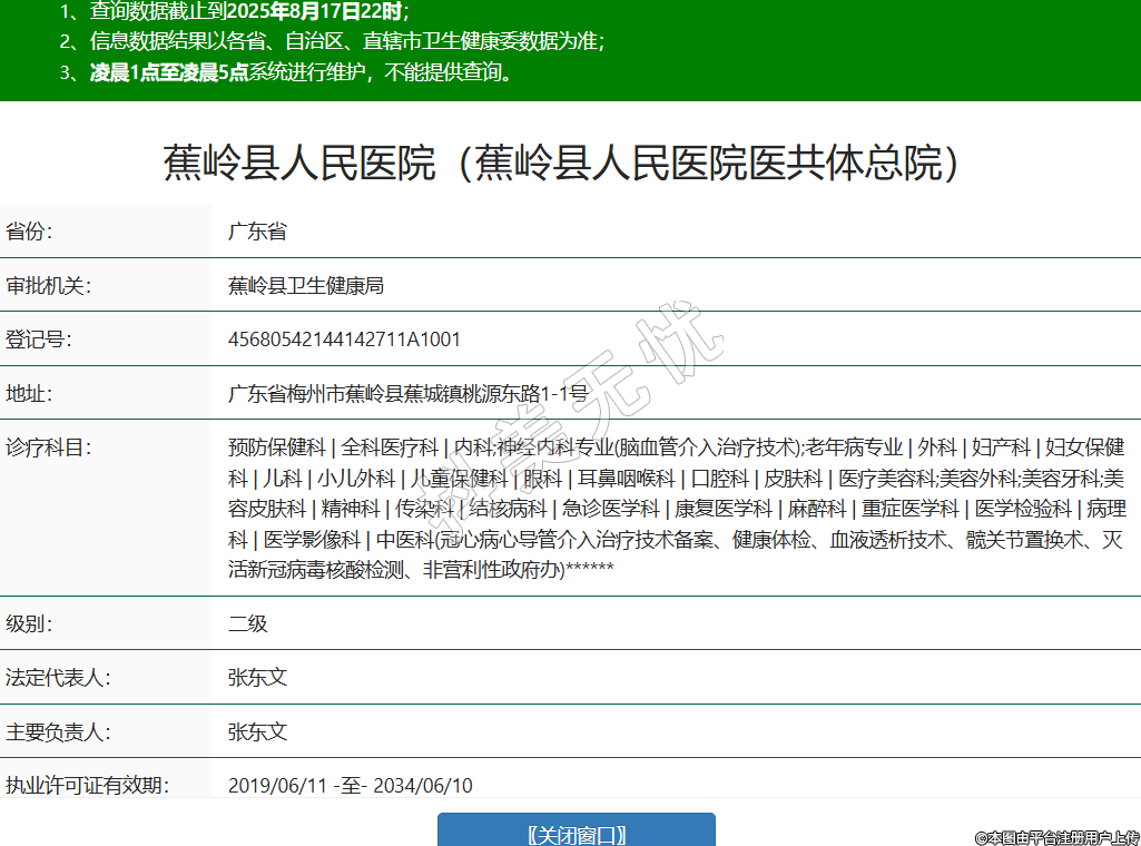 省份:廣東省審批機(jī)關(guān):蕉嶺縣衛(wèi)生健康局登記號(hào):45680542144142711A1001地址:廣東省梅州市蕉嶺縣蕉城鎮(zhèn)桃源東路1-1號(hào)診療科目:預(yù)防保健科 | 全科醫(yī)療科 | 內(nèi)科;神經(jīng)內(nèi)科專業(yè)(腦血管介入治療技術(shù));老年病專業(yè) | 外科 | 婦產(chǎn)科 | 婦女保健科 | 兒科 | 小兒外科 | 兒童保健科 | 眼科 | 耳鼻咽喉科 | 口腔科 | 皮膚科 | 醫(yī)療美容科;美容外科;美容牙科;美容皮膚科 | 精神科 | 傳染科 | 結(jié)核病科 | 急診醫(yī)學(xué)科 | 康復(fù)醫(yī)學(xué)科 | 麻醉科 | 重癥醫(yī)學(xué)科 | 醫(yī)學(xué)檢驗(yàn)科 | 病理科 | 醫(yī)學(xué)影像科 | 中醫(yī)科(冠心病心導(dǎo)管介入治療技術(shù)備案、健康體檢、血液透析技術(shù)、髖關(guān)節(jié)置換術(shù)、滅活新冠病毒核酸檢測(cè)、非營(yíng)利性政府辦)******級(jí)別:二級(jí)法定代表人:張東文主要負(fù)責(zé)人:張東文執(zhí)業(yè)許可證有效期:2019/06/11 -至- 2034/06/10 -