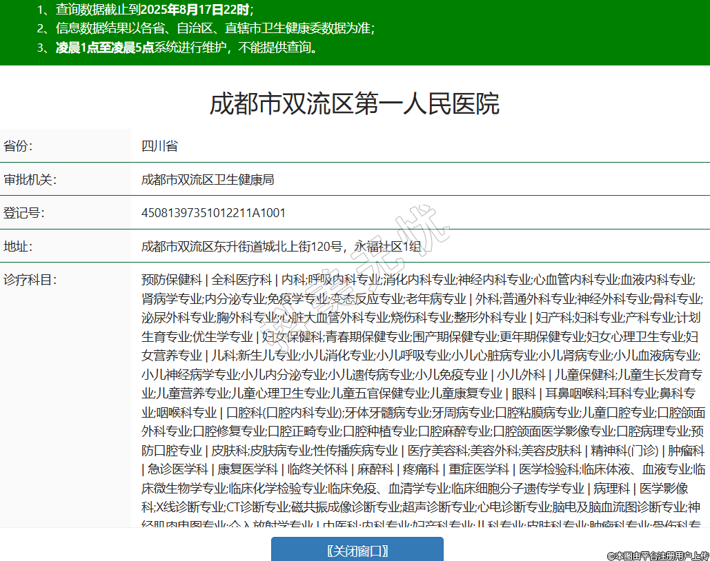 省份:四川省審批機(jī)關(guān):成都市雙流區(qū)衛(wèi)生健康局登記號(hào):45081397351012211A1001地址:成都市雙流區(qū)東升街道城北上街120號(hào),永福社區(qū)1組診療科目:預(yù)防保健科 | 全科醫(yī)療科 | 內(nèi)科;呼吸內(nèi)科專業(yè);消化內(nèi)科專業(yè);神經(jīng)內(nèi)科專業(yè);心血管內(nèi)科專業(yè);血液內(nèi)科專業(yè);腎病學(xué)專業(yè);內(nèi)分泌專業(yè);免疫學(xué)專業(yè);變態(tài)反應(yīng)專業(yè);老年病專業(yè) | 外科;普通外科專業(yè);神經(jīng)外科專業(yè);骨科專業(yè);泌尿外科專業(yè);胸外科專業(yè);心臟大血管外科專業(yè);燒傷科專業(yè);整形外科專業(yè) | 婦產(chǎn)科;婦科專業(yè);產(chǎn)科專業(yè);計(jì)劃生育專業(yè);優(yōu)生學(xué)專業(yè) | 婦女保健科;青春期保健專業(yè);圍產(chǎn)期保健專業(yè);更年期保健專業(yè);婦女心理衛(wèi)生專業(yè);婦女營(yíng)養(yǎng)專業(yè) | 兒科;新生兒專業(yè);小兒消化專業(yè);小兒呼吸專業(yè);小兒心臟病專業(yè);小兒腎病專業(yè);小兒血液病專業(yè);小兒神經(jīng)病學(xué)專業(yè);小兒內(nèi)分泌專業(yè);小兒遺傳病專業(yè);小兒免疫專業(yè) | 小兒外科 | 兒童保健科;兒童生長(zhǎng)發(fā)育專業(yè);兒童營(yíng)養(yǎng)專業(yè);兒童心理衛(wèi)生專業(yè);兒童五官保健專業(yè);兒童康復(fù)專業(yè) | 眼科 | 耳鼻咽喉科;耳科專業(yè);鼻科專業(yè);咽喉科專業(yè) | 口腔科(口腔內(nèi)科專業(yè));牙體牙髓病專業(yè);牙周病專業(yè);口腔粘膜病專業(yè);兒童口腔專業(yè);口腔頜面外科專業(yè);口腔修復(fù)專業(yè);口腔正畸專業(yè);口腔種植專業(yè);口腔麻醉專業(yè);口腔頜面醫(yī)學(xué)影像專業(yè);口腔病理專業(yè);預(yù)防口腔專業(yè) | 皮膚科;皮膚病專業(yè);性傳播疾病專業(yè) | 醫(yī)療美容科;美容外科;美容皮膚科 | 精神科(門診) | 腫瘤科 | 急診醫(yī)學(xué)科 | 康復(fù)醫(yī)學(xué)科 | 臨終關(guān)懷科 | 麻醉科 | 疼痛科 | 重癥醫(yī)學(xué)科 | 醫(yī)學(xué)檢驗(yàn)科;臨床體液、血液專業(yè);臨床微生物學(xué)專業(yè);臨床化學(xué)檢驗(yàn)專業(yè);臨床免疫、血清學(xué)專業(yè);臨床細(xì)胞分子遺傳學(xué)專業(yè) | 病理科 | 醫(yī)學(xué)影像科;X線診斷專業(yè);CT診斷專業(yè);磁共振成像診斷專業(yè);超聲診斷專業(yè);心電診斷專業(yè);腦電及腦血流圖診斷專業(yè);神經(jīng)肌肉電圖專業(yè);介入放射學(xué)專業(yè) | 中醫(yī)科;內(nèi)科專業(yè);婦產(chǎn)科專業(yè);兒科專業(yè);皮膚科專業(yè);腫瘤科專業(yè);骨傷科專業(yè);肛腸科專業(yè);老年病科專業(yè);針灸科專業(yè);推拿科專業(yè);康復(fù)醫(yī)學(xué)專業(yè);預(yù)防保健科專業(yè) | 中西醫(yī)結(jié)合科(限神經(jīng)內(nèi)科,心血管內(nèi)科,腎內(nèi)科,內(nèi)分泌科,普外科,神經(jīng)外科,骨科,泌尿外科,婦科,皮膚病專業(yè),腫瘤科,中醫(yī)骨傷科,中醫(yī)肛腸科,中醫(yī)康復(fù)醫(yī)學(xué)科開展互聯(lián)網(wǎng)診療)******級(jí)別:三級(jí)法定代表人:萬(wàn)美華主要負(fù)責(zé)人:執(zhí)業(yè)許可證有效期:2023/04/28 -至- 2038/05/01 -