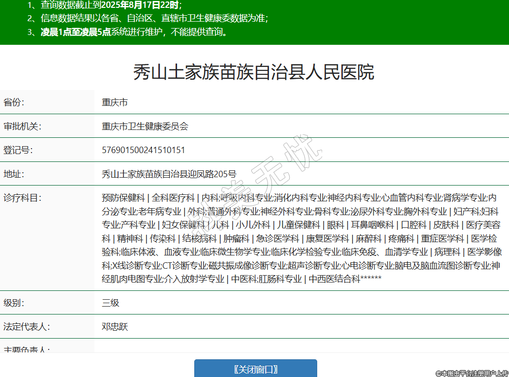 省份:重慶市審批機(jī)關(guān):重慶市衛(wèi)生健康委員會登記號:576901500241510151地址:秀山土家族苗族自治縣迎鳳路205號診療科目:預(yù)防保健科 | 全科醫(yī)療科 | 內(nèi)科;呼吸內(nèi)科專業(yè);消化內(nèi)科專業(yè);神經(jīng)內(nèi)科專業(yè);心血管內(nèi)科專業(yè);腎病學(xué)專業(yè);內(nèi)分泌專業(yè);老年病專業(yè) | 外科;普通外科專業(yè);神經(jīng)外科專業(yè);骨科專業(yè);泌尿外科專業(yè);胸外科專業(yè) | 婦產(chǎn)科;婦科專業(yè);產(chǎn)科專業(yè) | 婦女保健科 | 兒科 | 小兒外科 | 兒童保健科 | 眼科 | 耳鼻咽喉科 | 口腔科 | 皮膚科 | 醫(yī)療美容科 | 精神科 | 傳染科 | 結(jié)核病科 | 腫瘤科 | 急診醫(yī)學(xué)科 | 康復(fù)醫(yī)學(xué)科 | 麻醉科 | 疼痛科 | 重癥醫(yī)學(xué)科 | 醫(yī)學(xué)檢驗(yàn)科;臨床體液、血液專業(yè);臨床微生物學(xué)專業(yè);臨床化學(xué)檢驗(yàn)專業(yè);臨床免疫、血清學(xué)專業(yè) | 病理科 | 醫(yī)學(xué)影像科;X線診斷專業(yè);CT診斷專業(yè);磁共振成像診斷專業(yè);超聲診斷專業(yè);心電診斷專業(yè);腦電及腦血流圖診斷專業(yè);神經(jīng)肌肉電圖專業(yè);介入放射學(xué)專業(yè) | 中醫(yī)科;肛腸科專業(yè) | 中西醫(yī)結(jié)合科******級別:三級法定代表人:鄧忠躍主要負(fù)責(zé)人:執(zhí)業(yè)許可證有效期:2016/08/30 -至- 2031/08/29 -