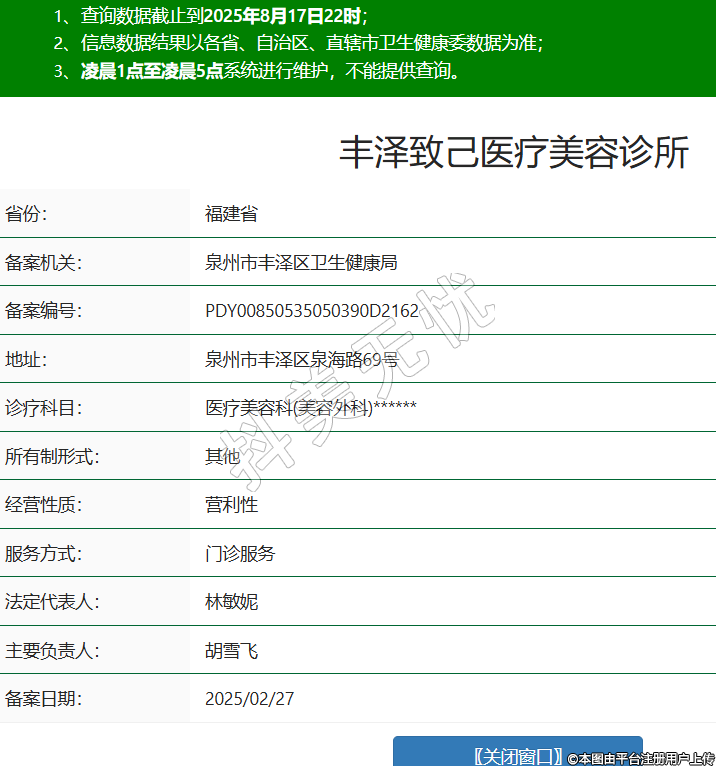 省份:福建省備案機關:泉州市豐澤區(qū)衛(wèi)生健康局備案編號:PDY00850535050390D2162地址:泉州市豐澤區(qū)泉海路69號診療科目:醫(yī)療美容科(美容外科)******所有制形式:其他經(jīng)營性質(zhì):營利性服務方式:門診服務法定代表人:林敏妮主要負責人:胡雪飛備案日期:2025/02/27 -