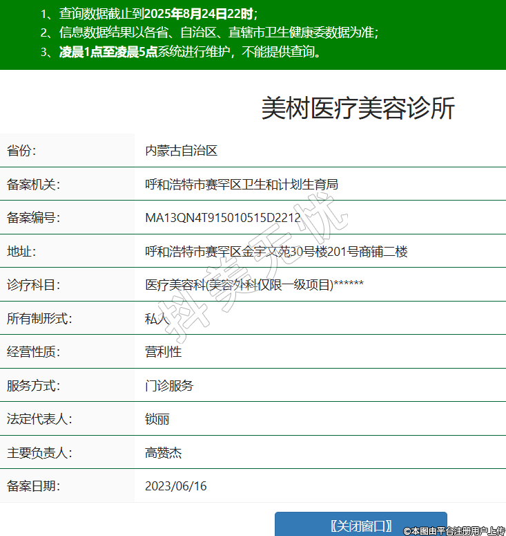 省份:內(nèi)蒙古自治區(qū)備案機(jī)關(guān):呼和浩特市賽罕區(qū)衛(wèi)生和計(jì)劃生育局備案編號(hào):MA13QN4T915010515D2212地址:呼和浩特市賽罕區(qū)金宇文苑30號(hào)樓201號(hào)商鋪二樓診療科目:醫(yī)療美容科(美容外科僅限一級(jí)項(xiàng)目)******所有制形式:私人經(jīng)營(yíng)性質(zhì):營(yíng)利性服務(wù)方式:門(mén)診服務(wù)法定代表人:鎖麗主要負(fù)責(zé)人:高贊杰備案日期:2023/06/16 -