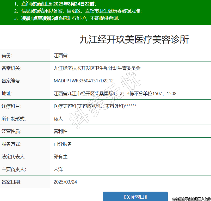 省份:江西省備案機關(guān):九江經(jīng)濟技術(shù)開發(fā)區(qū)衛(wèi)生和計劃生育委員會備案編號:MADPPTWR336041317D2212地址:江西省九江市經(jīng)開區(qū)柴桑國際1、2、3棟不分單位1507、1508診療科目:醫(yī)療美容科(美容皮膚科、美容外科)******所有制形式:私人經(jīng)營性質(zhì):營利性服務(wù)方式:門診服務(wù)法定代表人:鄭有生主要負(fù)責(zé)人:宋洋備案日期:2025/03/24 -