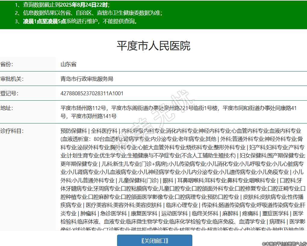 省份:山東省審批機關:青島市行政審批服務局登記號:42788085237028311A1001地址:平度市揚州路112號,平度市東閣街道辦事處泉州路221號臨街1號樓,平度市同和街道辦事處同康路41號,平度市鄭州路141號診療科目:預防保健科 | 全科醫(yī)療科 | 內(nèi)科;呼吸內(nèi)科專業(yè);消化內(nèi)科專業(yè);神經(jīng)內(nèi)科專業(yè);心血管內(nèi)科專業(yè);血液內(nèi)科專業(yè)(血液透析室:80臺血透機);腎病學專業(yè);內(nèi)分泌專業(yè);老年病專業(yè);其他 | 外科;普通外科專業(yè);神經(jīng)外科專業(yè);骨科專業(yè);泌尿外科專業(yè);胸外科專業(yè);心臟大血管外科專業(yè);燒傷科專業(yè);整形外科專業(yè) | 婦產(chǎn)科;婦科專業(yè);產(chǎn)科專業(yè);計劃生育專業(yè);優(yōu)生學專業(yè);生殖健康與不孕癥專業(yè)(不含人工輔助生殖技術) | 婦女保健科;圍產(chǎn)期保健專業(yè);更年期保健專業(yè) | 兒科;新生兒專業(yè)(門診+病房);小兒傳染病專業(yè);小兒消化專業(yè);小兒呼吸專業(yè);小兒心臟病專業(yè);小兒腎病專業(yè);小兒血液病專業(yè);小兒神經(jīng)病學專業(yè);小兒內(nèi)分泌專業(yè);小兒遺傳病專業(yè);小兒免疫專業(yè) | 小兒外科;小兒普通外科專業(yè) | 兒童保健科(門診) | 眼科 | 耳鼻咽喉科;耳科專業(yè);鼻科專業(yè);咽喉科專業(yè) | 口腔科;牙體牙髓病專業(yè);牙周病專業(yè);口腔粘膜病專業(yè);兒童口腔專業(yè);口腔頜面外科專業(yè);口腔修復專業(yè);口腔正畸專業(yè);口腔種植專業(yè);口腔麻醉專業(yè);口腔頜面醫(yī)學影像專業(yè);口腔病理專業(yè);預防口腔專業(yè) | 皮膚科;皮膚病專業(yè);性傳播疾病專業(yè) | 醫(yī)療美容科;美容外科;美容皮膚科 | 臨床心理專業(yè) | 傳染科;腸道傳染病專業(yè);呼吸道傳染病專業(yè);肝炎專業(yè) | 腫瘤科 | 急診醫(yī)學科 | 康復醫(yī)學科 | 運動醫(yī)學科 | 臨終關懷科 | 麻醉科 | 疼痛科 | 重癥醫(yī)學科 | 醫(yī)學檢驗科;臨床體液、血液專業(yè);臨床微生物學專業(yè);臨床化學檢驗專業(yè);臨床免疫、血清學專業(yè) | 病理科 | 醫(yī)學影像科;X線診斷專業(yè);CT診斷專業(yè);磁共振成像診斷專業(yè);核醫(yī)學專業(yè);超聲診斷專業(yè);心電診斷專業(yè);腦電及腦血流圖診斷專業(yè);神經(jīng)肌肉電圖專業(yè);介入放射學專業(yè);放射治療專業(yè) | 中醫(yī)科;內(nèi)科專業(yè);皮膚科專業(yè)(門診);針灸科專業(yè);推拿科專業(yè) | 中西醫(yī)結(jié)合科******級別:三級法定代表人:李成職主要負責人:李成職執(zhí)業(yè)許可證有效期:2017/06/22 -至- 2028/10/21 -