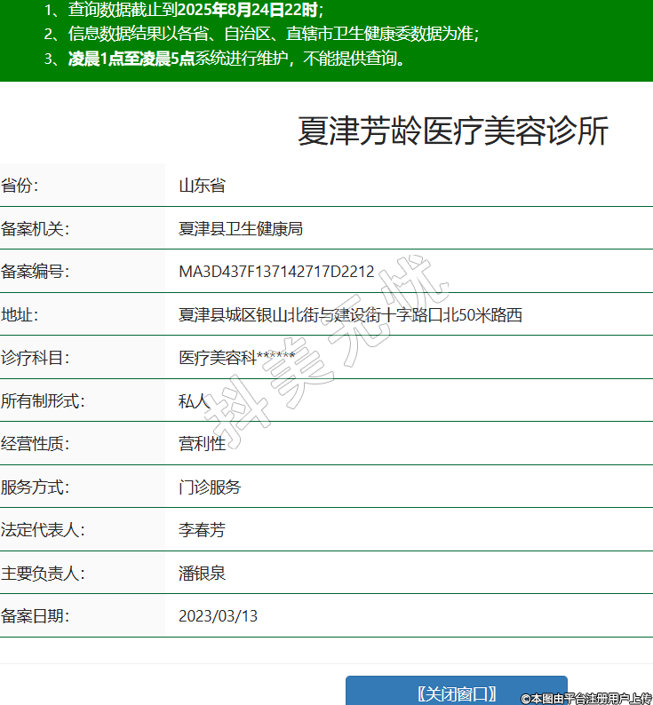 省份:山東省備案機關(guān):夏津縣衛(wèi)生健康局備案編號:MA3D437F137142717D2212地址:夏津縣城區(qū)銀山北街與建設(shè)街十字路口北50米路西診療科目:醫(yī)療美容科******所有制形式:私人經(jīng)營性質(zhì):營利性服務方式:門診服務法定代表人:李春芳主要負責人:潘銀泉備案日期:2023/03/13 -