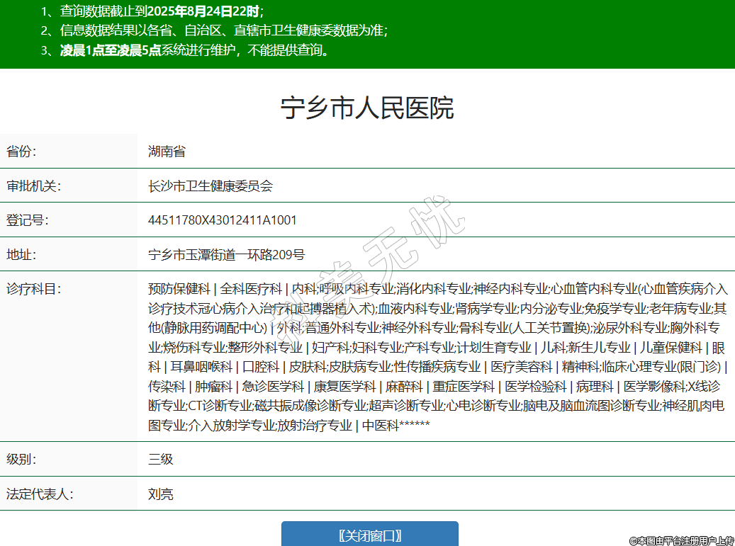 省份:湖南省審批機(jī)關(guān):長沙市衛(wèi)生健康委員會登記號:44511780X43012411A1001地址:寧鄉(xiāng)市玉潭街道一環(huán)路209號診療科目:預(yù)防保健科 | 全科醫(yī)療科 | 內(nèi)科;呼吸內(nèi)科專業(yè);消化內(nèi)科專業(yè);神經(jīng)內(nèi)科專業(yè);心血管內(nèi)科專業(yè)(心血管疾病介入診療技術(shù)冠心病介入治療和起搏器植入術(shù));血液內(nèi)科專業(yè);腎病學(xué)專業(yè);內(nèi)分泌專業(yè);免疫學(xué)專業(yè);老年病專業(yè);其他(靜脈用藥調(diào)配中心) | 外科;普通外科專業(yè);神經(jīng)外科專業(yè);骨科專業(yè)(人工關(guān)節(jié)置換);泌尿外科專業(yè);胸外科專業(yè);燒傷科專業(yè);整形外科專業(yè) | 婦產(chǎn)科;婦科專業(yè);產(chǎn)科專業(yè);計(jì)劃生育專業(yè) | 兒科;新生兒專業(yè) | 兒童保健科 | 眼科 | 耳鼻咽喉科 | 口腔科 | 皮膚科;皮膚病專業(yè);性傳播疾病專業(yè) | 醫(yī)療美容科 | 精神科;臨床心理專業(yè)(限門診) | 傳染科 | 腫瘤科 | 急診醫(yī)學(xué)科 | 康復(fù)醫(yī)學(xué)科 | 麻醉科 | 重癥醫(yī)學(xué)科 | 醫(yī)學(xué)檢驗(yàn)科 | 病理科 | 醫(yī)學(xué)影像科;X線診斷專業(yè);CT診斷專業(yè);磁共振成像診斷專業(yè);超聲診斷專業(yè);心電診斷專業(yè);腦電及腦血流圖診斷專業(yè);神經(jīng)肌肉電圖專業(yè);介入放射學(xué)專業(yè);放射治療專業(yè) | 中醫(yī)科******級別:三級法定代表人:劉亮主要負(fù)責(zé)人:劉亮執(zhí)業(yè)許可證有效期:2024/04/02 -至- 2029/04/01 -