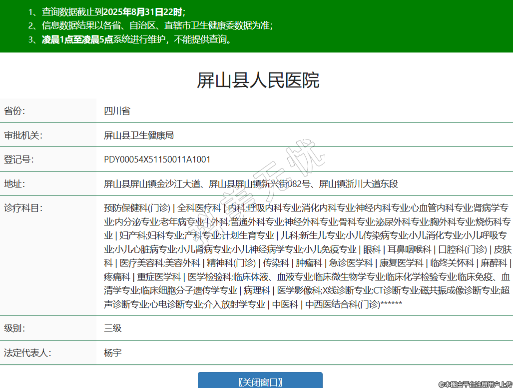 省份:四川省審批機關(guān):屏山縣衛(wèi)生健康局登記號:PDY00054X51150011A1001地址:屏山縣屏山鎮(zhèn)金沙江大道、屏山縣屏山鎮(zhèn)新興街082號、屏山鎮(zhèn)浙川大道東段診療科目:預(yù)防保健科(門診) | 全科醫(yī)療科 | 內(nèi)科;呼吸內(nèi)科專業(yè);消化內(nèi)科專業(yè);神經(jīng)內(nèi)科專業(yè);心血管內(nèi)科專業(yè);腎病學(xué)專業(yè);內(nèi)分泌專業(yè);老年病專業(yè) | 外科;普通外科專業(yè);神經(jīng)外科專業(yè);骨科專業(yè);泌尿外科專業(yè);胸外科專業(yè);燒傷科專業(yè) | 婦產(chǎn)科;婦科專業(yè);產(chǎn)科專業(yè);計劃生育專業(yè) | 兒科;新生兒專業(yè);小兒傳染病專業(yè);小兒消化專業(yè);小兒呼吸專業(yè);小兒心臟病專業(yè);小兒腎病專業(yè);小兒神經(jīng)病學(xué)專業(yè);小兒免疫專業(yè) | 眼科 | 耳鼻咽喉科 | 口腔科(門診) | 皮膚科 | 醫(yī)療美容科;美容外科 | 精神科(門診) | 傳染科 | 腫瘤科 | 急診醫(yī)學(xué)科 | 康復(fù)醫(yī)學(xué)科 | 臨終關(guān)懷科 | 麻醉科 | 疼痛科 | 重癥醫(yī)學(xué)科 | 醫(yī)學(xué)檢驗科;臨床體液、血液專業(yè);臨床微生物學(xué)專業(yè);臨床化學(xué)檢驗專業(yè);臨床免疫、血清學(xué)專業(yè);臨床細(xì)胞分子遺傳學(xué)專業(yè) | 病理科 | 醫(yī)學(xué)影像科;X線診斷專業(yè);CT診斷專業(yè);磁共振成像診斷專業(yè);超聲診斷專業(yè);心電診斷專業(yè);介入放射學(xué)專業(yè) | 中醫(yī)科 | 中西醫(yī)結(jié)合科(門診)******級別:三級法定代表人:楊宇主要負(fù)責(zé)人:楊宇執(zhí)業(yè)許可證有效期:2014/12/31 -至- 2029/12/30 -