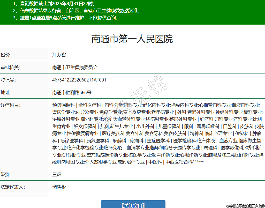 省份:江蘇省審批機(jī)關(guān):南通市衛(wèi)生健康委員會(huì)登記號(hào):46754122232060211A1001地址:南通市勝利路666號(hào)診療科目:預(yù)防保健科 | 全科醫(yī)療科 | 內(nèi)科;呼吸內(nèi)科專業(yè);消化內(nèi)科專業(yè);神經(jīng)內(nèi)科專業(yè);心血管內(nèi)科專業(yè);血液內(nèi)科專業(yè);腎病學(xué)專業(yè);內(nèi)分泌專業(yè);免疫學(xué)專業(yè);變態(tài)反應(yīng)專業(yè);老年病專業(yè) | 外科;普通外科專業(yè);神經(jīng)外科專業(yè);骨科專業(yè);泌尿外科專業(yè);胸外科專業(yè);心臟大血管外科專業(yè);燒傷科專業(yè);整形外科專業(yè) | 婦產(chǎn)科;婦科專業(yè);產(chǎn)科專業(yè);計(jì)劃生育專業(yè) | 婦女保健科 | 兒科;新生兒專業(yè) | 小兒外科 | 兒童保健科 | 眼科 | 耳鼻咽喉科 | 口腔科 | 皮膚科;皮膚病專業(yè);性傳播疾病專業(yè) | 醫(yī)療美容科;美容外科;美容牙科;美容皮膚科 | 精神科;臨床心理專業(yè) | 傳染科 | 腫瘤科 | 急診醫(yī)學(xué)科 | 康復(fù)醫(yī)學(xué)科 | 麻醉科 | 疼痛科 | 重癥醫(yī)學(xué)科 | 醫(yī)學(xué)檢驗(yàn)科;臨床體液、血液專業(yè);臨床微生物學(xué)專業(yè);臨床化學(xué)檢驗(yàn)專業(yè);臨床免疫、血清學(xué)專業(yè);臨床細(xì)胞分子遺傳學(xué)專業(yè) | 病理科 | 醫(yī)學(xué)影像科;X線診斷專業(yè);CT診斷專業(yè);磁共振成像診斷專業(yè);核醫(yī)學(xué)專業(yè);超聲診斷專業(yè);心電診斷專業(yè);腦電及腦血流圖診斷專業(yè);神經(jīng)肌肉電圖專業(yè);介入放射學(xué)專業(yè);放射治療專業(yè) | 中醫(yī)科 | 中西醫(yī)結(jié)合科******級(jí)別:三級(jí)法定代表人:儲(chǔ)曉彬主要負(fù)責(zé)人:盧紅建執(zhí)業(yè)許可證有效期:2023/08/11 -至- 2035/12/27 -