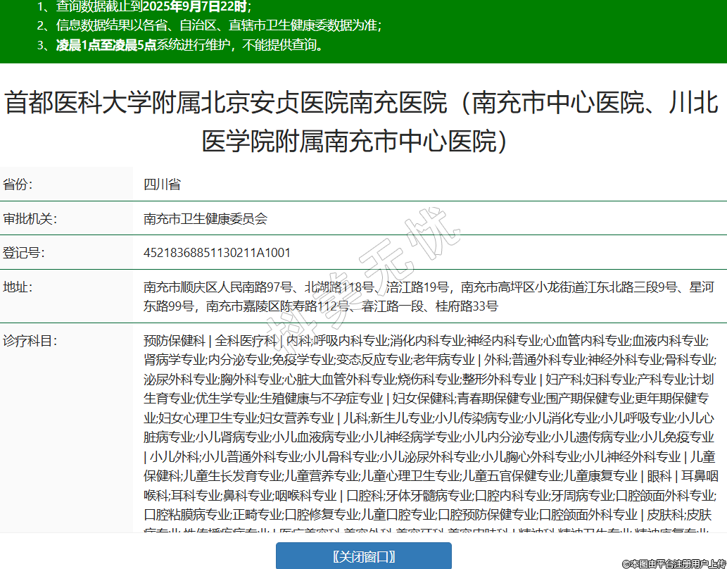 省份:四川省審批機(jī)關(guān):南充市衛(wèi)生健康委員會(huì)登記號:45218368851130211A1001地址:南充市順慶區(qū)人民南路97號、北湖路118號、涪江路19號,南充市高坪區(qū)小龍街道江東北路三段9號、星河?xùn)|路99號,南充市嘉陵區(qū)陳壽路112號、春江路一段、桂府路33號診療科目:預(yù)防保健科 | 全科醫(yī)療科 | 內(nèi)科;呼吸內(nèi)科專業(yè);消化內(nèi)科專業(yè);神經(jīng)內(nèi)科專業(yè);心血管內(nèi)科專業(yè);血液內(nèi)科專業(yè);腎病學(xué)專業(yè);內(nèi)分泌專業(yè);免疫學(xué)專業(yè);變態(tài)反應(yīng)專業(yè);老年病專業(yè) | 外科;普通外科專業(yè);神經(jīng)外科專業(yè);骨科專業(yè);泌尿外科專業(yè);胸外科專業(yè);心臟大血管外科專業(yè);燒傷科專業(yè);整形外科專業(yè) | 婦產(chǎn)科;婦科專業(yè);產(chǎn)科專業(yè);計(jì)劃生育專業(yè);優(yōu)生學(xué)專業(yè);生殖健康與不孕癥專業(yè) | 婦女保健科;青春期保健專業(yè);圍產(chǎn)期保健專業(yè);更年期保健專業(yè);婦女心理衛(wèi)生專業(yè);婦女營養(yǎng)專業(yè) | 兒科;新生兒專業(yè);小兒傳染病專業(yè);小兒消化專業(yè);小兒呼吸專業(yè);小兒心臟病專業(yè);小兒腎病專業(yè);小兒血液病專業(yè);小兒神經(jīng)病學(xué)專業(yè);小兒內(nèi)分泌專業(yè);小兒遺傳病專業(yè);小兒免疫專業(yè) | 小兒外科;小兒普通外科專業(yè);小兒骨科專業(yè);小兒泌尿外科專業(yè);小兒胸心外科專業(yè);小兒神經(jīng)外科專業(yè) | 兒童保健科;兒童生長發(fā)育專業(yè);兒童營養(yǎng)專業(yè);兒童心理衛(wèi)生專業(yè);兒童五官保健專業(yè);兒童康復(fù)專業(yè) | 眼科 | 耳鼻咽喉科;耳科專業(yè);鼻科專業(yè);咽喉科專業(yè) | 口腔科;牙體牙髓病專業(yè);口腔內(nèi)科專業(yè);牙周病專業(yè);口腔頜面外科專業(yè);口腔粘膜病專業(yè);正畸專業(yè);口腔修復(fù)專業(yè);兒童口腔專業(yè);口腔預(yù)防保健專業(yè);口腔頜面外科專業(yè) | 皮膚科;皮膚病專業(yè);性傳播疾病專業(yè) | 醫(yī)療美容科;美容外科;美容牙科;美容皮膚科 | 精神科;精神衛(wèi)生專業(yè);精神康復(fù)專業(yè);臨床心理專業(yè) | 傳染科;腸道傳染病專業(yè);呼吸道傳染病專業(yè);肝炎專業(yè);蟲媒傳染病專業(yè);動(dòng)物源性傳染病專業(yè);蠕蟲病專業(yè) | 結(jié)核病科 | 腫瘤科 | 急診醫(yī)學(xué)科 | 康復(fù)醫(yī)學(xué)科 | 職業(yè)病科(門診);職業(yè)中毒專業(yè)(門診);塵肺專業(yè)(門診);放射病專業(yè)(門診);物理因素?fù)p傷專業(yè)(門診);職業(yè)健康監(jiān)護(hù)專業(yè)(門診) | 麻醉科 | 疼痛科 | 重癥醫(yī)學(xué)科 | 醫(yī)學(xué)檢驗(yàn)科;臨床體液、血液專業(yè);臨床微生物學(xué)專業(yè);臨床化學(xué)檢驗(yàn)專業(yè);臨床免疫、血清學(xué)專業(yè);臨床細(xì)胞分子遺傳學(xué)專業(yè) | 病理科 | 醫(yī)學(xué)影像科;X線診斷專業(yè);CT診斷專業(yè);磁共振成像診斷專業(yè);核醫(yī)學(xué)專業(yè);超聲診斷專業(yè);心電診斷專業(yè);腦電及腦血流圖診斷專業(yè);神經(jīng)肌肉電圖專業(yè);介入放射學(xué)專業(yè);放射治療專業(yè) | 中醫(yī)科;內(nèi)科專業(yè);外科專業(yè);婦產(chǎn)科專業(yè);兒科專業(yè);眼科專業(yè);耳鼻咽喉科專業(yè);腫瘤科專業(yè);骨傷科專業(yè);肛腸科專業(yè);老年病科專業(yè);針灸科專業(yè);推拿科專業(yè);康復(fù)醫(yī)學(xué)專業(yè);急診科專業(yè) | 中西醫(yī)結(jié)合科******級別:三級法定代表人:劉楊主要負(fù)責(zé)人:劉楊執(zhí)業(yè)許可證有效期:2025/07/03 -至- 2036/09/14 -