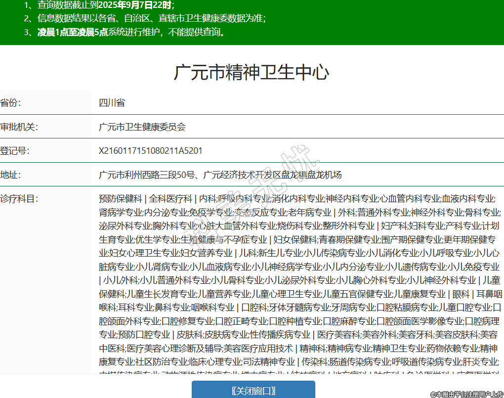 省份:四川省審批機(jī)關(guān):廣元市衛(wèi)生健康委員會登記號:X2160117151080211A5201地址:廣元市利州西路三段50號、廣元經(jīng)濟(jì)技術(shù)開發(fā)區(qū)盤龍鎮(zhèn)盤龍機(jī)場診療科目:預(yù)防保健科 | 全科醫(yī)療科 | 內(nèi)科;呼吸內(nèi)科專業(yè);消化內(nèi)科專業(yè);神經(jīng)內(nèi)科專業(yè);心血管內(nèi)科專業(yè);血液內(nèi)科專業(yè);腎病學(xué)專業(yè);內(nèi)分泌專業(yè);免疫學(xué)專業(yè);變態(tài)反應(yīng)專業(yè);老年病專業(yè) | 外科;普通外科專業(yè);神經(jīng)外科專業(yè);骨科專業(yè);泌尿外科專業(yè);胸外科專業(yè);心臟大血管外科專業(yè);燒傷科專業(yè);整形外科專業(yè) | 婦產(chǎn)科;婦科專業(yè);產(chǎn)科專業(yè);計(jì)劃生育專業(yè);優(yōu)生學(xué)專業(yè);生殖健康與不孕癥專業(yè) | 婦女保健科;青春期保健專業(yè);圍產(chǎn)期保健專業(yè);更年期保健專業(yè);婦女心理衛(wèi)生專業(yè);婦女營養(yǎng)專業(yè) | 兒科;新生兒專業(yè);小兒傳染病專業(yè);小兒消化專業(yè);小兒呼吸專業(yè);小兒心臟病專業(yè);小兒腎病專業(yè);小兒血液病專業(yè);小兒神經(jīng)病學(xué)專業(yè);小兒內(nèi)分泌專業(yè);小兒遺傳病專業(yè);小兒免疫專業(yè) | 小兒外科;小兒普通外科專業(yè);小兒骨科專業(yè);小兒泌尿外科專業(yè);小兒胸心外科專業(yè);小兒神經(jīng)外科專業(yè) | 兒童保健科;兒童生長發(fā)育專業(yè);兒童營養(yǎng)專業(yè);兒童心理衛(wèi)生專業(yè);兒童五官保健專業(yè);兒童康復(fù)專業(yè) | 眼科 | 耳鼻咽喉科;耳科專業(yè);鼻科專業(yè);咽喉科專業(yè) | 口腔科;牙體牙髓病專業(yè);牙周病專業(yè);口腔粘膜病專業(yè);兒童口腔專業(yè);口腔頜面外科專業(yè);口腔修復(fù)專業(yè);口腔正畸專業(yè);口腔種植專業(yè);口腔麻醉專業(yè);口腔頜面醫(yī)學(xué)影像專業(yè);口腔病理專業(yè);預(yù)防口腔專業(yè) | 皮膚科;皮膚病專業(yè);性傳播疾病專業(yè) | 醫(yī)療美容科;美容外科;美容牙科;美容皮膚科;美容中醫(yī)科;醫(yī)療美容心理診斷及輔導(dǎo);美容醫(yī)療應(yīng)用技術(shù) | 精神科;精神病專業(yè);精神衛(wèi)生專業(yè);藥物依賴專業(yè);精神康復(fù)專業(yè);社區(qū)防治專業(yè);臨床心理專業(yè);司法精神專業(yè) | 傳染科;腸道傳染病專業(yè);呼吸道傳染病專業(yè);肝炎專業(yè);蟲媒傳染病專業(yè);動物源性傳染病專業(yè);蠕蟲病專業(yè) | 結(jié)核病科 | 地方病科 | 腫瘤科 | 急診醫(yī)學(xué)科 | 康復(fù)醫(yī)學(xué)科 | 運(yùn)動醫(yī)學(xué)科 | 職業(yè)病科;職業(yè)中毒專業(yè);塵肺專業(yè);放射病專業(yè);物理因素?fù)p傷專業(yè);職業(yè)健康監(jiān)護(hù)專業(yè) | 臨終關(guān)懷科 | 麻醉科 | 疼痛科 | 重癥醫(yī)學(xué)科 | 醫(yī)學(xué)檢驗(yàn)科;臨床體液、血液專業(yè);臨床微生物學(xué)專業(yè);臨床化學(xué)檢驗(yàn)專業(yè);臨床免疫、血清學(xué)專業(yè);臨床細(xì)胞分子遺傳學(xué)專業(yè) | 病理科 | 醫(yī)學(xué)影像科;X線診斷專業(yè);CT診斷專業(yè);磁共振成像診斷專業(yè);超聲診斷專業(yè);心電診斷專業(yè);腦電及腦血流圖診斷專業(yè);神經(jīng)肌肉電圖專業(yè);介入放射學(xué)專業(yè);放射治療專業(yè) | 中醫(yī)科;內(nèi)科專業(yè);外科專業(yè);婦產(chǎn)科專業(yè);兒科專業(yè);皮膚科專業(yè);耳鼻咽喉科專業(yè);骨傷科專業(yè);肛腸科專業(yè);老年病科專業(yè);針灸科專業(yè);推拿科專業(yè);康復(fù)醫(yī)學(xué)專業(yè);急診科專業(yè) | 中西醫(yī)結(jié)合科******級別:三級法定代表人:孫武主要負(fù)責(zé)人:孫武執(zhí)業(yè)許可證有效期:2025/09/04 -至- 2040/09/03 -