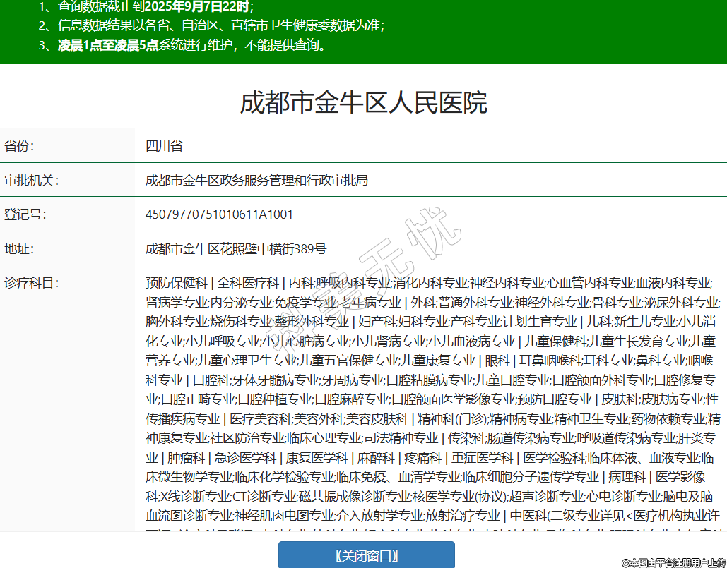 省份:四川省審批機關(guān):成都市金牛區(qū)政務(wù)服務(wù)管理和行政審批局登記號:45079770751010611A1001地址:成都市金牛區(qū)花照壁中橫街389號診療科目:預(yù)防保健科 | 全科醫(yī)療科 | 內(nèi)科;呼吸內(nèi)科專業(yè);消化內(nèi)科專業(yè);神經(jīng)內(nèi)科專業(yè);心血管內(nèi)科專業(yè);血液內(nèi)科專業(yè);腎病學(xué)專業(yè);內(nèi)分泌專業(yè);免疫學(xué)專業(yè);老年病專業(yè) | 外科;普通外科專業(yè);神經(jīng)外科專業(yè);骨科專業(yè);泌尿外科專業(yè);胸外科專業(yè);燒傷科專業(yè);整形外科專業(yè) | 婦產(chǎn)科;婦科專業(yè);產(chǎn)科專業(yè);計劃生育專業(yè) | 兒科;新生兒專業(yè);小兒消化專業(yè);小兒呼吸專業(yè);小兒心臟病專業(yè);小兒腎病專業(yè);小兒血液病專業(yè) | 兒童保健科;兒童生長發(fā)育專業(yè);兒童營養(yǎng)專業(yè);兒童心理衛(wèi)生專業(yè);兒童五官保健專業(yè);兒童康復(fù)專業(yè) | 眼科 | 耳鼻咽喉科;耳科專業(yè);鼻科專業(yè);咽喉科專業(yè) | 口腔科;牙體牙髓病專業(yè);牙周病專業(yè);口腔粘膜病專業(yè);兒童口腔專業(yè);口腔頜面外科專業(yè);口腔修復(fù)專業(yè);口腔正畸專業(yè);口腔種植專業(yè);口腔麻醉專業(yè);口腔頜面醫(yī)學(xué)影像專業(yè);預(yù)防口腔專業(yè) | 皮膚科;皮膚病專業(yè);性傳播疾病專業(yè) | 醫(yī)療美容科;美容外科;美容皮膚科 | 精神科(門診);精神病專業(yè);精神衛(wèi)生專業(yè);藥物依賴專業(yè);精神康復(fù)專業(yè);社區(qū)防治專業(yè);臨床心理專業(yè);司法精神專業(yè) | 傳染科;腸道傳染病專業(yè);呼吸道傳染病專業(yè);肝炎專業(yè) | 腫瘤科 | 急診醫(yī)學(xué)科 | 康復(fù)醫(yī)學(xué)科 | 麻醉科 | 疼痛科 | 重癥醫(yī)學(xué)科 | 醫(yī)學(xué)檢驗科;臨床體液、血液專業(yè);臨床微生物學(xué)專業(yè);臨床化學(xué)檢驗專業(yè);臨床免疫、血清學(xué)專業(yè);臨床細胞分子遺傳學(xué)專業(yè) | 病理科 | 醫(yī)學(xué)影像科;X線診斷專業(yè);CT診斷專業(yè);磁共振成像診斷專業(yè);核醫(yī)學(xué)專業(yè)(協(xié)議);超聲診斷專業(yè);心電診斷專業(yè);腦電及腦血流圖診斷專業(yè);神經(jīng)肌肉電圖專業(yè);介入放射學(xué)專業(yè);放射治療專業(yè) | 中醫(yī)科(二級專業(yè)詳見<醫(yī)療機構(gòu)執(zhí)業(yè)許可證>診療科目登記);內(nèi)科專業(yè);外科專業(yè);婦產(chǎn)科專業(yè);兒科專業(yè);皮膚科專業(yè);骨傷科專業(yè);肛腸科專業(yè);老年病科專業(yè);針灸科專業(yè);推拿科專業(yè);康復(fù)醫(yī)學(xué)專業(yè) | 中西醫(yī)結(jié)合科******級別:三級法定代表人:翁一文主要負責(zé)人: -