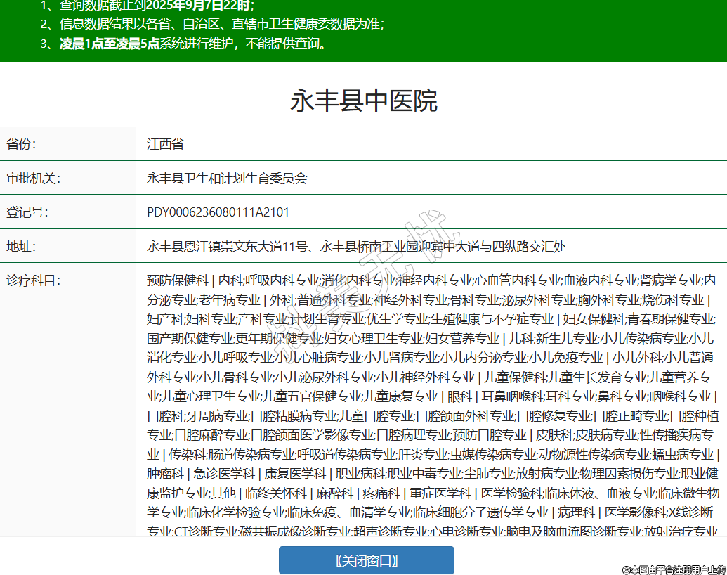 省份:江西省審批機關:永豐縣衛(wèi)生和計劃生育委員會登記號:PDY0006236080111A2101地址:永豐縣恩江鎮(zhèn)崇文東大道11號、永豐縣橋南工業(yè)園迎賓中大道與四縱路交匯處診療科目:預防保健科 | 內(nèi)科;呼吸內(nèi)科專業(yè);消化內(nèi)科專業(yè);神經(jīng)內(nèi)科專業(yè);心血管內(nèi)科專業(yè);血液內(nèi)科專業(yè);腎病學專業(yè);內(nèi)分泌專業(yè);老年病專業(yè) | 外科;普通外科專業(yè);神經(jīng)外科專業(yè);骨科專業(yè);泌尿外科專業(yè);胸外科專業(yè);燒傷科專業(yè) | 婦產(chǎn)科;婦科專業(yè);產(chǎn)科專業(yè);計劃生育專業(yè);優(yōu)生學專業(yè);生殖健康與不孕癥專業(yè) | 婦女保健科;青春期保健專業(yè);圍產(chǎn)期保健專業(yè);更年期保健專業(yè);婦女心理衛(wèi)生專業(yè);婦女營養(yǎng)專業(yè) | 兒科;新生兒專業(yè);小兒傳染病專業(yè);小兒消化專業(yè);小兒呼吸專業(yè);小兒心臟病專業(yè);小兒腎病專業(yè);小兒內(nèi)分泌專業(yè);小兒免疫專業(yè) | 小兒外科;小兒普通外科專業(yè);小兒骨科專業(yè);小兒泌尿外科專業(yè);小兒神經(jīng)外科專業(yè) | 兒童保健科;兒童生長發(fā)育專業(yè);兒童營養(yǎng)專業(yè);兒童心理衛(wèi)生專業(yè);兒童五官保健專業(yè);兒童康復專業(yè) | 眼科 | 耳鼻咽喉科;耳科專業(yè);鼻科專業(yè);咽喉科專業(yè) | 口腔科;牙周病專業(yè);口腔粘膜病專業(yè);兒童口腔專業(yè);口腔頜面外科專業(yè);口腔修復專業(yè);口腔正畸專業(yè);口腔種植專業(yè);口腔麻醉專業(yè);口腔頜面醫(yī)學影像專業(yè);口腔病理專業(yè);預防口腔專業(yè) | 皮膚科;皮膚病專業(yè);性傳播疾病專業(yè) | 傳染科;腸道傳染病專業(yè);呼吸道傳染病專業(yè);肝炎專業(yè);蟲媒傳染病專業(yè);動物源性傳染病專業(yè);蠕蟲病專業(yè) | 腫瘤科 | 急診醫(yī)學科 | 康復醫(yī)學科 | 職業(yè)病科;職業(yè)中毒專業(yè);塵肺專業(yè);放射病專業(yè);物理因素損傷專業(yè);職業(yè)健康監(jiān)護專業(yè);其他 | 臨終關懷科 | 麻醉科 | 疼痛科 | 重癥醫(yī)學科 | 醫(yī)學檢驗科;臨床體液、血液專業(yè);臨床微生物學專業(yè);臨床化學檢驗專業(yè);臨床免疫、血清學專業(yè);臨床細胞分子遺傳學專業(yè) | 病理科 | 醫(yī)學影像科;X線診斷專業(yè);CT診斷專業(yè);磁共振成像診斷專業(yè);超聲診斷專業(yè);心電診斷專業(yè);腦電及腦血流圖診斷專業(yè);放射治療專業(yè) | 中醫(yī)科;內(nèi)科專業(yè);外科專業(yè);婦產(chǎn)科專業(yè);皮膚科專業(yè);眼科專業(yè);腫瘤科專業(yè);骨傷科專業(yè);肛腸科專業(yè);老年病科專業(yè);針灸科專業(yè);推拿科專業(yè);康復醫(yī)學專業(yè);預防保健科專業(yè) | 中西醫(yī)結合科******級別:三級法定代表人:廖永華主要負責人:廖永華執(zhí)業(yè)許可證有效期:2012/07/09 -至- 2027/07/01 -