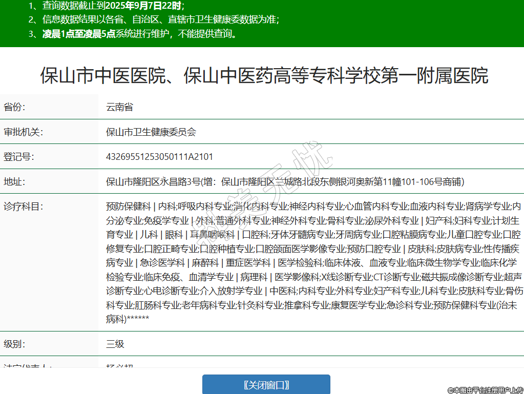 省份:云南省審批機(jī)關(guān):保山市衛(wèi)生健康委員會(huì)登記號(hào):43269551253050111A2101地址:保山市隆陽(yáng)區(qū)永昌路3號(hào)(增:保山市隆陽(yáng)區(qū)蘭城路北段東側(cè)銀河奧新第11幢101-106號(hào)商鋪)診療科目:預(yù)防保健科 | 內(nèi)科;呼吸內(nèi)科專(zhuān)業(yè);消化內(nèi)科專(zhuān)業(yè);神經(jīng)內(nèi)科專(zhuān)業(yè);心血管內(nèi)科專(zhuān)業(yè);血液內(nèi)科專(zhuān)業(yè);腎病學(xué)專(zhuān)業(yè);內(nèi)分泌專(zhuān)業(yè);免疫學(xué)專(zhuān)業(yè) | 外科;普通外科專(zhuān)業(yè);神經(jīng)外科專(zhuān)業(yè);骨科專(zhuān)業(yè);泌尿外科專(zhuān)業(yè) | 婦產(chǎn)科;婦科專(zhuān)業(yè);計(jì)劃生育專(zhuān)業(yè) | 兒科 | 眼科 | 耳鼻咽喉科 | 口腔科;牙體牙髓病專(zhuān)業(yè);牙周病專(zhuān)業(yè);口腔粘膜病專(zhuān)業(yè);兒童口腔專(zhuān)業(yè);口腔修復(fù)專(zhuān)業(yè);口腔正畸專(zhuān)業(yè);口腔種植專(zhuān)業(yè);口腔頜面醫(yī)學(xué)影像專(zhuān)業(yè);預(yù)防口腔專(zhuān)業(yè) | 皮膚科;皮膚病專(zhuān)業(yè);性傳播疾病專(zhuān)業(yè) | 急診醫(yī)學(xué)科 | 麻醉科 | 重癥醫(yī)學(xué)科 | 醫(yī)學(xué)檢驗(yàn)科;臨床體液、血液專(zhuān)業(yè);臨床微生物學(xué)專(zhuān)業(yè);臨床化學(xué)檢驗(yàn)專(zhuān)業(yè);臨床免疫、血清學(xué)專(zhuān)業(yè) | 病理科 | 醫(yī)學(xué)影像科;X線診斷專(zhuān)業(yè);CT診斷專(zhuān)業(yè);磁共振成像診斷專(zhuān)業(yè);超聲診斷專(zhuān)業(yè);心電診斷專(zhuān)業(yè);介入放射學(xué)專(zhuān)業(yè) | 中醫(yī)科;內(nèi)科專(zhuān)業(yè);外科專(zhuān)業(yè);婦產(chǎn)科專(zhuān)業(yè);兒科專(zhuān)業(yè);皮膚科專(zhuān)業(yè);骨傷科專(zhuān)業(yè);肛腸科專(zhuān)業(yè);老年病科專(zhuān)業(yè);針灸科專(zhuān)業(yè);推拿科專(zhuān)業(yè);康復(fù)醫(yī)學(xué)專(zhuān)業(yè);急診科專(zhuān)業(yè);預(yù)防保健科專(zhuān)業(yè)(治未病科)******級(jí)別:三級(jí)法定代表人:楊必超主要負(fù)責(zé)人:楊必超執(zhí)業(yè)許可證有效期:2025/03/24 -至- 2040/03/23 -