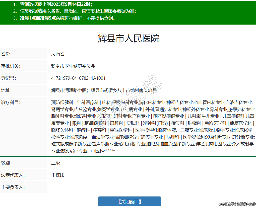 省份:河南省審批機關(guān):新鄉(xiāng)市衛(wèi)生健康委員會登記號:41721979-641078211A1001地址:輝縣市清暉路中段;輝縣市胡橋鄉(xiāng)八十畝地村南頭01號診療科目:預(yù)防保健科 | 全科醫(yī)療科 | 內(nèi)科;呼吸內(nèi)科專業(yè);消化內(nèi)科專業(yè);神經(jīng)內(nèi)科專業(yè);心血管內(nèi)科專業(yè);血液內(nèi)科專業(yè);腎病學(xué)專業(yè);內(nèi)分泌專業(yè);免疫學(xué)專業(yè);老年病專業(yè) | 外科;普通外科專業(yè);神經(jīng)外科專業(yè);骨科專業(yè);泌尿外科專業(yè);胸外科專業(yè);燒傷科專業(yè) | 婦產(chǎn)科;婦科專業(yè);產(chǎn)科專業(yè) | 圍產(chǎn)期保健專業(yè) | 兒科;新生兒專業(yè) | 兒童保健科;兒童康復(fù)專業(yè) | 眼科 | 耳鼻咽喉科 | 口腔科 | 皮膚科 | 精神科(門診) | 傳染科 | 腫瘤科 | 急診醫(yī)學(xué)科 | 康復(fù)醫(yī)學(xué)科 | 臨終關(guān)懷科 | 麻醉科 | 疼痛科 | 重癥醫(yī)學(xué)科 | 醫(yī)學(xué)檢驗科;臨床體液、血液專業(yè);臨床微生物學(xué)專業(yè);臨床化學(xué)檢驗專業(yè);臨床免疫、血清學(xué)專業(yè);臨床細胞分子遺傳學(xué)專業(yè) | 病理科 | 醫(yī)學(xué)影像科;X線診斷專業(yè);CT診斷專業(yè);磁共振成像診斷專業(yè);超聲診斷專業(yè);心電診斷專業(yè);腦電及腦血流圖診斷專業(yè);神經(jīng)肌肉電圖專業(yè);介入放射學(xué)專業(yè);放射治療專業(yè) | 中醫(yī)科******級別:三級法定代表人:王棟印主要負責(zé)人:執(zhí)業(yè)許可證有效期:2024/11/12 -至- 2036/12/15 -