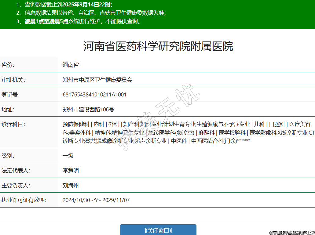 省份:河南省審批機(jī)關(guān):鄭州市中原區(qū)衛(wèi)生健康委員會(huì)登記號(hào):68176543841010211A1001地址:鄭州市建設(shè)西路106號(hào)診療科目:預(yù)防保健科 | 內(nèi)科 | 外科 | 婦產(chǎn)科;婦科專業(yè);計(jì)劃生育專業(yè);生殖健康與不孕癥專業(yè) | 兒科 | 口腔科 | 醫(yī)療美容科;美容外科 | 精神科;精神衛(wèi)生專業(yè) | 急診醫(yī)學(xué)科(急診室) | 麻醉科 | 醫(yī)學(xué)檢驗(yàn)科 | 醫(yī)學(xué)影像科;X線診斷專業(yè);CT診斷專業(yè);磁共振成像診斷專業(yè);超聲診斷專業(yè) | 中醫(yī)科 | 中西醫(yī)結(jié)合科(門診)******級(jí)別:一級(jí)法定代表人:李慧明主要負(fù)責(zé)人:劉海州執(zhí)業(yè)許可證有效期:2024/10/30 -至- 2029/11/07 -