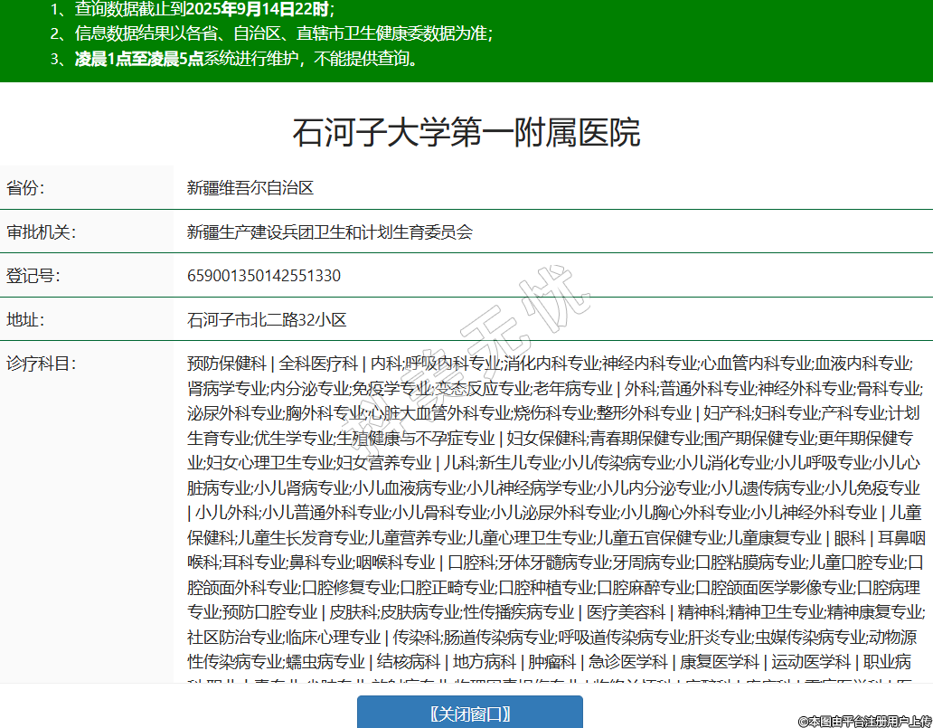 省份:新疆維吾爾自治區(qū)審批機(jī)關(guān):新疆生產(chǎn)建設(shè)兵團(tuán)衛(wèi)生和計(jì)劃生育委員會登記號:659001350142551330地址:石河子市北二路32小區(qū)診療科目:預(yù)防保健科 | 全科醫(yī)療科 | 內(nèi)科;呼吸內(nèi)科專業(yè);消化內(nèi)科專業(yè);神經(jīng)內(nèi)科專業(yè);心血管內(nèi)科專業(yè);血液內(nèi)科專業(yè);腎病學(xué)專業(yè);內(nèi)分泌專業(yè);免疫學(xué)專業(yè);變態(tài)反應(yīng)專業(yè);老年病專業(yè) | 外科;普通外科專業(yè);神經(jīng)外科專業(yè);骨科專業(yè);泌尿外科專業(yè);胸外科專業(yè);心臟大血管外科專業(yè);燒傷科專業(yè);整形外科專業(yè) | 婦產(chǎn)科;婦科專業(yè);產(chǎn)科專業(yè);計(jì)劃生育專業(yè);優(yōu)生學(xué)專業(yè);生殖健康與不孕癥專業(yè) | 婦女保健科;青春期保健專業(yè);圍產(chǎn)期保健專業(yè);更年期保健專業(yè);婦女心理衛(wèi)生專業(yè);婦女營養(yǎng)專業(yè) | 兒科;新生兒專業(yè);小兒傳染病專業(yè);小兒消化專業(yè);小兒呼吸專業(yè);小兒心臟病專業(yè);小兒腎病專業(yè);小兒血液病專業(yè);小兒神經(jīng)病學(xué)專業(yè);小兒內(nèi)分泌專業(yè);小兒遺傳病專業(yè);小兒免疫專業(yè) | 小兒外科;小兒普通外科專業(yè);小兒骨科專業(yè);小兒泌尿外科專業(yè);小兒胸心外科專業(yè);小兒神經(jīng)外科專業(yè) | 兒童保健科;兒童生長發(fā)育專業(yè);兒童營養(yǎng)專業(yè);兒童心理衛(wèi)生專業(yè);兒童五官保健專業(yè);兒童康復(fù)專業(yè) | 眼科 | 耳鼻咽喉科;耳科專業(yè);鼻科專業(yè);咽喉科專業(yè) | 口腔科;牙體牙髓病專業(yè);牙周病專業(yè);口腔粘膜病專業(yè);兒童口腔專業(yè);口腔頜面外科專業(yè);口腔修復(fù)專業(yè);口腔正畸專業(yè);口腔種植專業(yè);口腔麻醉專業(yè);口腔頜面醫(yī)學(xué)影像專業(yè);口腔病理專業(yè);預(yù)防口腔專業(yè) | 皮膚科;皮膚病專業(yè);性傳播疾病專業(yè) | 醫(yī)療美容科 | 精神科;精神衛(wèi)生專業(yè);精神康復(fù)專業(yè);社區(qū)防治專業(yè);臨床心理專業(yè) | 傳染科;腸道傳染病專業(yè);呼吸道傳染病專業(yè);肝炎專業(yè);蟲媒傳染病專業(yè);動物源性傳染病專業(yè);蠕蟲病專業(yè) | 結(jié)核病科 | 地方病科 | 腫瘤科 | 急診醫(yī)學(xué)科 | 康復(fù)醫(yī)學(xué)科 | 運(yùn)動醫(yī)學(xué)科 | 職業(yè)病科;職業(yè)中毒專業(yè);塵肺專業(yè);放射病專業(yè);物理因素?fù)p傷專業(yè) | 臨終關(guān)懷科 | 麻醉科 | 疼痛科 | 重癥醫(yī)學(xué)科 | 醫(yī)學(xué)檢驗(yàn)科;臨床體液、血液專業(yè);臨床微生物學(xué)專業(yè);臨床化學(xué)檢驗(yàn)專業(yè);臨床免疫、血清學(xué)專業(yè);臨床細(xì)胞分子遺傳學(xué)專業(yè) | 病理科 | 醫(yī)學(xué)影像科;X線診斷專業(yè);CT診斷專業(yè);磁共振成像診斷專業(yè);核醫(yī)學(xué)專業(yè);超聲診斷專業(yè);心電診斷專業(yè);腦電及腦血流圖診斷專業(yè);神經(jīng)肌肉電圖專業(yè);介入放射學(xué)專業(yè);放射治療專業(yè) | 中醫(yī)科;內(nèi)科專業(yè);外科專業(yè);婦產(chǎn)科專業(yè);兒科專業(yè);皮膚科專業(yè);腫瘤科專業(yè);肛腸科專業(yè);老年病科專業(yè);針灸科專業(yè);推拿科專業(yè);康復(fù)醫(yī)學(xué)專業(yè);預(yù)防保健科專業(yè) | 中西醫(yī)結(jié)合科******級別:三級法定代表人:王維山主要負(fù)責(zé)人:王維山執(zhí)業(yè)許可證有效期:2023/01/20 -至- 2032/06/13 -