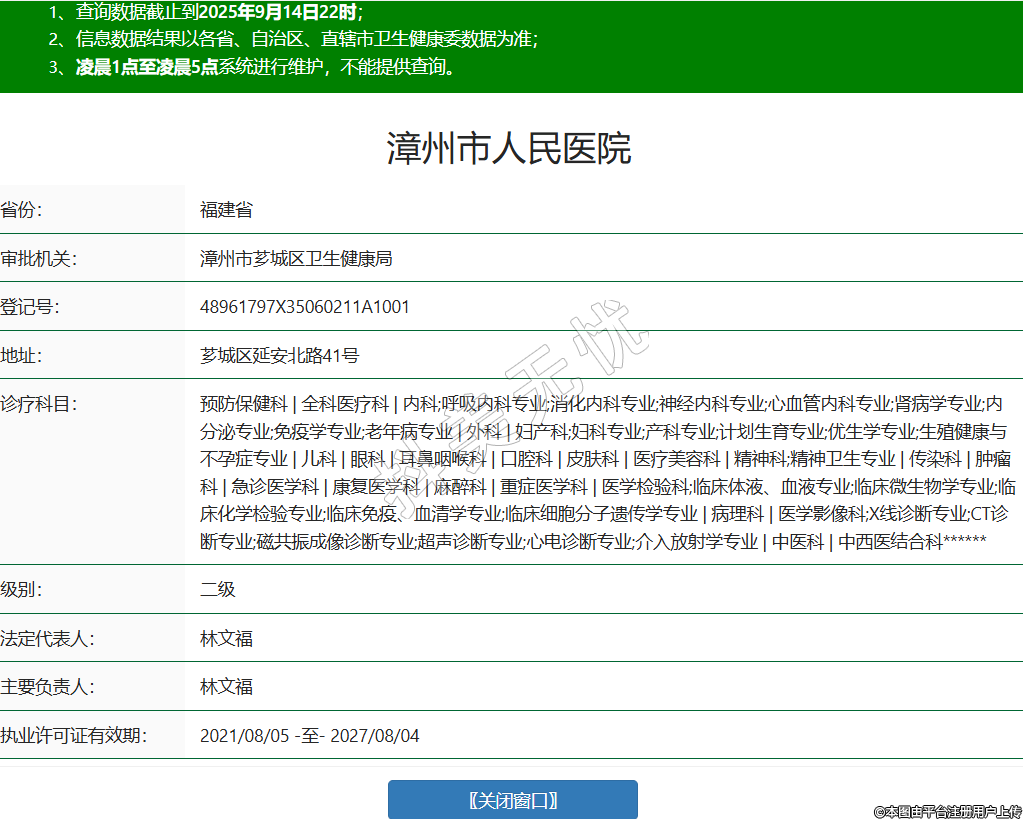 省份:福建省審批機(jī)關(guān):漳州市薌城區(qū)衛(wèi)生健康局登記號:48961797X35060211A1001地址:薌城區(qū)延安北路41號診療科目:預(yù)防保健科 | 全科醫(yī)療科 | 內(nèi)科;呼吸內(nèi)科專業(yè);消化內(nèi)科專業(yè);神經(jīng)內(nèi)科專業(yè);心血管內(nèi)科專業(yè);腎病學(xué)專業(yè);內(nèi)分泌專業(yè);免疫學(xué)專業(yè);老年病專業(yè) | 外科 | 婦產(chǎn)科;婦科專業(yè);產(chǎn)科專業(yè);計(jì)劃生育專業(yè);優(yōu)生學(xué)專業(yè);生殖健康與不孕癥專業(yè) | 兒科 | 眼科 | 耳鼻咽喉科 | 口腔科 | 皮膚科 | 醫(yī)療美容科 | 精神科;精神衛(wèi)生專業(yè) | 傳染科 | 腫瘤科 | 急診醫(yī)學(xué)科 | 康復(fù)醫(yī)學(xué)科 | 麻醉科 | 重癥醫(yī)學(xué)科 | 醫(yī)學(xué)檢驗(yàn)科;臨床體液、血液專業(yè);臨床微生物學(xué)專業(yè);臨床化學(xué)檢驗(yàn)專業(yè);臨床免疫、血清學(xué)專業(yè);臨床細(xì)胞分子遺傳學(xué)專業(yè) | 病理科 | 醫(yī)學(xué)影像科;X線診斷專業(yè);CT診斷專業(yè);磁共振成像診斷專業(yè);超聲診斷專業(yè);心電診斷專業(yè);介入放射學(xué)專業(yè) | 中醫(yī)科 | 中西醫(yī)結(jié)合科******級別:二級法定代表人:林文福主要負(fù)責(zé)人:林文福執(zhí)業(yè)許可證有效期:2021/08/05 -至- 2027/08/04 -
