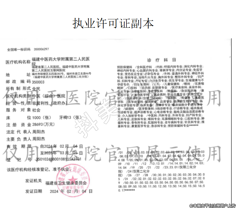 省份:福建省審批機(jī)關(guān):福建省衛(wèi)生健康委員會登記號:35010248800108111A2101地址:福州市鼓樓區(qū)五四路282號,福州市連江北路46號(福建中醫(yī)藥大學(xué)附屬第二人民醫(yī)院二化分院)診療科目:預(yù)防保健科 | 全科醫(yī)療科 | 內(nèi)科;呼吸內(nèi)科專業(yè);消化內(nèi)科專業(yè);神經(jīng)內(nèi)科專業(yè);心血管內(nèi)科專業(yè);腎病學(xué)專業(yè);內(nèi)分泌專業(yè);免疫學(xué)專業(yè);變態(tài)反應(yīng)專業(yè);老年病專業(yè) | 外科;普通外科專業(yè);神經(jīng)外科專業(yè);骨科專業(yè);泌尿外科專業(yè);胸外科專業(yè);整形外科專業(yè) | 婦產(chǎn)科;婦科專業(yè);產(chǎn)科專業(yè);計劃生育專業(yè);優(yōu)生學(xué)專業(yè);生殖健康與不孕癥專業(yè) | 婦女保健科 | 兒科 | 兒童保健科 | 眼科 | 耳鼻咽喉科 | 口腔科 | 皮膚科;皮膚病專業(yè) | 醫(yī)療美容科;美容外科;美容牙科;美容皮膚科;美容中醫(yī)科 | 腫瘤科 | 急診醫(yī)學(xué)科 | 康復(fù)醫(yī)學(xué)科 | 運動醫(yī)學(xué)科 | 職業(yè)病科;職業(yè)中毒專業(yè)(僅限二化分院) | 臨終關(guān)懷科(僅限二化分院) | 麻醉科 | 疼痛科 | 重癥醫(yī)學(xué)科 | 醫(yī)學(xué)檢驗科;臨床體液、血液專業(yè);臨床微生物學(xué)專業(yè);臨床化學(xué)檢驗專業(yè);臨床免疫、血清學(xué)專業(yè);臨床細(xì)胞分子遺傳學(xué)專業(yè) | 病理科 | 醫(yī)學(xué)影像科;X線診斷專業(yè);CT診斷專業(yè);磁共振成像診斷專業(yè);超聲診斷專業(yè);心電診斷專業(yè);腦電及腦血流圖診斷專業(yè);介入放射學(xué)專業(yè) | 中醫(yī)科;內(nèi)科專業(yè);外科專業(yè);婦產(chǎn)科專業(yè);兒科專業(yè);皮膚科專業(yè);眼科專業(yè);耳鼻咽喉科專業(yè);口腔科專業(yè);腫瘤科專業(yè);骨傷科專業(yè);肛腸科專業(yè);老年病科專業(yè);針灸科專業(yè);推拿科專業(yè);康復(fù)醫(yī)學(xué)專業(yè);急診科專業(yè);預(yù)防保健科專業(yè)******級別:三級法定代表人:周陽杰主要負(fù)責(zé)人:周陽杰執(zhí)業(yè)許可證有效期:2025/04/03 -至- 2026/03/25 -