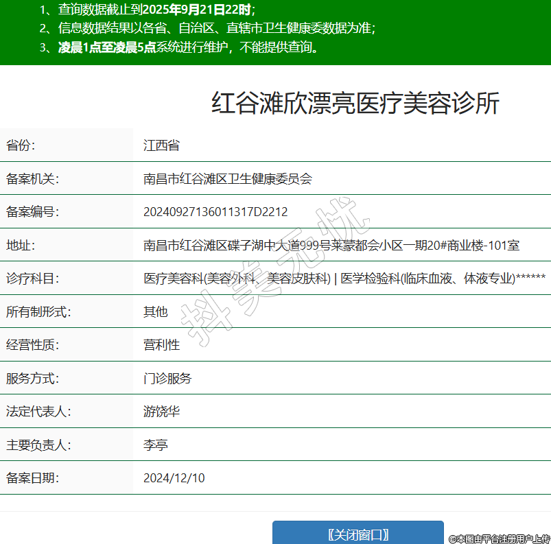 省份:江西省備案機(jī)關(guān):南昌市紅谷灘區(qū)衛(wèi)生健康委員會備案編號:20240927136011317D2212地址:南昌市紅谷灘區(qū)碟子湖中大道999號萊蒙都會小區(qū)一期20#商業(yè)樓-101室診療科目:醫(yī)療美容科(美容外科、美容皮膚科) | 醫(yī)學(xué)檢驗(yàn)科(臨床血液、體液專業(yè))******所有制形式:其他經(jīng)營性質(zhì):營利性服務(wù)方式:門診服務(wù)法定代表人:游饒華主要負(fù)責(zé)人:李亭備案日期:2024/12/10 -