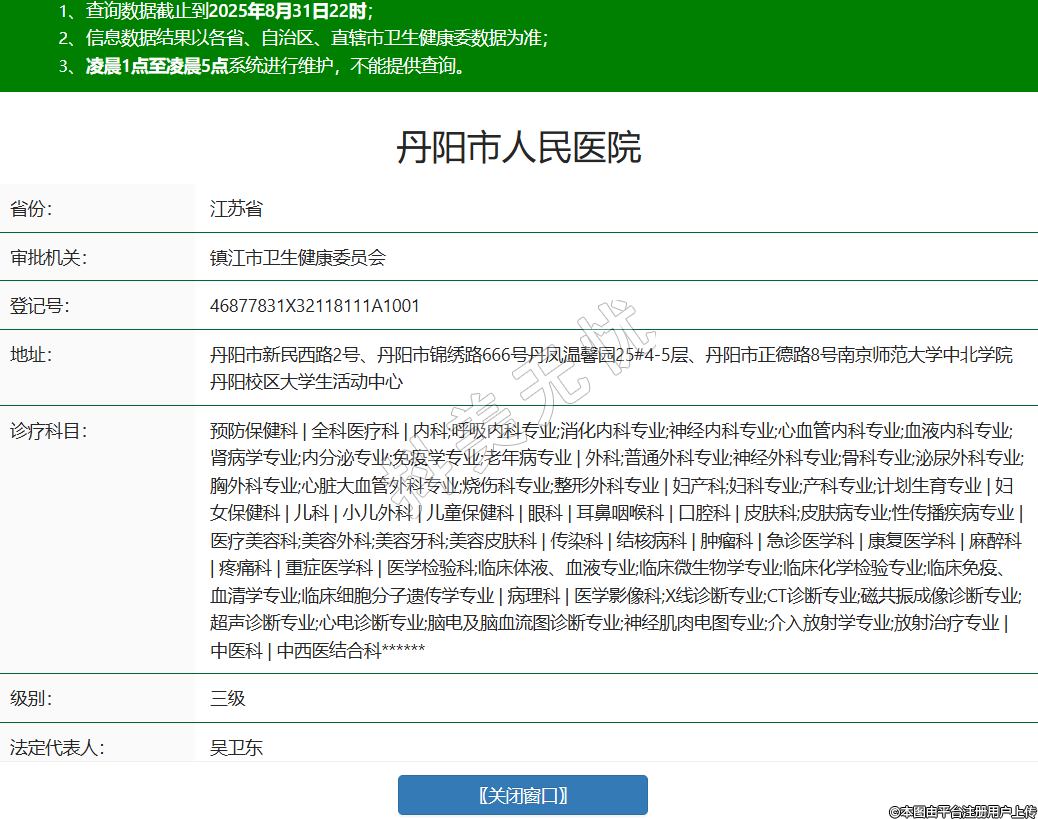 省份:江蘇省審批機(jī)關(guān):鎮(zhèn)江市衛(wèi)生健康委員會(huì)登記號(hào):46877831X32118111A1001地址:丹陽市新民西路2號(hào)、丹陽市錦繡路666號(hào)丹鳳溫馨園25#4-5層、丹陽市正德路8號(hào)南京師范大學(xué)中北學(xué)院丹陽校區(qū)大學(xué)生活動(dòng)中心診療科目:預(yù)防保健科 | 全科醫(yī)療科 | 內(nèi)科;呼吸內(nèi)科專業(yè);消化內(nèi)科專業(yè);神經(jīng)內(nèi)科專業(yè);心血管內(nèi)科專業(yè);血液內(nèi)科專業(yè);腎病學(xué)專業(yè);內(nèi)分泌專業(yè);免疫學(xué)專業(yè);老年病專業(yè) | 外科;普通外科專業(yè);神經(jīng)外科專業(yè);骨科專業(yè);泌尿外科專業(yè);胸外科專業(yè);心臟大血管外科專業(yè);燒傷科專業(yè);整形外科專業(yè) | 婦產(chǎn)科;婦科專業(yè);產(chǎn)科專業(yè);計(jì)劃生育專業(yè) | 婦女保健科 | 兒科 | 小兒外科 | 兒童保健科 | 眼科 | 耳鼻咽喉科 | 口腔科 | 皮膚科;皮膚病專業(yè);性傳播疾病專業(yè) | 醫(yī)療美容科;美容外科;美容牙科;美容皮膚科 | 傳染科 | 結(jié)核病科 | 腫瘤科 | 急診醫(yī)學(xué)科 | 康復(fù)醫(yī)學(xué)科 | 麻醉科 | 疼痛科 | 重癥醫(yī)學(xué)科 | 醫(yī)學(xué)檢驗(yàn)科;臨床體液、血液專業(yè);臨床微生物學(xué)專業(yè);臨床化學(xué)檢驗(yàn)專業(yè);臨床免疫、血清學(xué)專業(yè);臨床細(xì)胞分子遺傳學(xué)專業(yè) | 病理科 | 醫(yī)學(xué)影像科;X線診斷專業(yè);CT診斷專業(yè);磁共振成像診斷專業(yè);超聲診斷專業(yè);心電診斷專業(yè);腦電及腦血流圖診斷專業(yè);神經(jīng)肌肉電圖專業(yè);介入放射學(xué)專業(yè);放射治療專業(yè) | 中醫(yī)科 | 中西醫(yī)結(jié)合科******級(jí)別:三級(jí)法定代表人:吳衛(wèi)東主要負(fù)責(zé)人:吳衛(wèi)東執(zhí)業(yè)許可證有效期:2023/07/13 -至- 2038/01/11 -