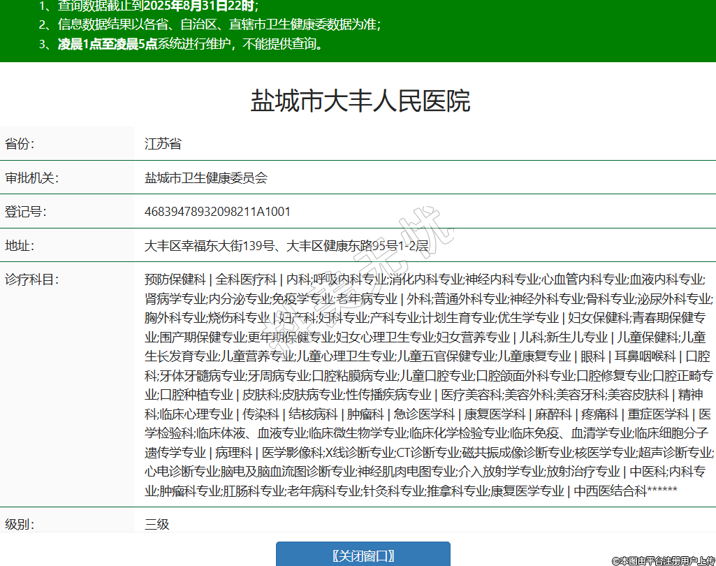 省份:江蘇省審批機關(guān):鹽城市衛(wèi)生健康委員會登記號:46839478932098211A1001地址:大豐區(qū)幸福東大街139號、大豐區(qū)健康東路95號1-2層診療科目:預(yù)防保健科 | 全科醫(yī)療科 | 內(nèi)科;呼吸內(nèi)科專業(yè);消化內(nèi)科專業(yè);神經(jīng)內(nèi)科專業(yè);心血管內(nèi)科專業(yè);血液內(nèi)科專業(yè);腎病學(xué)專業(yè);內(nèi)分泌專業(yè);免疫學(xué)專業(yè);老年病專業(yè) | 外科;普通外科專業(yè);神經(jīng)外科專業(yè);骨科專業(yè);泌尿外科專業(yè);胸外科專業(yè);燒傷科專業(yè) | 婦產(chǎn)科;婦科專業(yè);產(chǎn)科專業(yè);計劃生育專業(yè);優(yōu)生學(xué)專業(yè) | 婦女保健科;青春期保健專業(yè);圍產(chǎn)期保健專業(yè);更年期保健專業(yè);婦女心理衛(wèi)生專業(yè);婦女營養(yǎng)專業(yè) | 兒科;新生兒專業(yè) | 兒童保健科;兒童生長發(fā)育專業(yè);兒童營養(yǎng)專業(yè);兒童心理衛(wèi)生專業(yè);兒童五官保健專業(yè);兒童康復(fù)專業(yè) | 眼科 | 耳鼻咽喉科 | 口腔科;牙體牙髓病專業(yè);牙周病專業(yè);口腔粘膜病專業(yè);兒童口腔專業(yè);口腔頜面外科專業(yè);口腔修復(fù)專業(yè);口腔正畸專業(yè);口腔種植專業(yè) | 皮膚科;皮膚病專業(yè);性傳播疾病專業(yè) | 醫(yī)療美容科;美容外科;美容牙科;美容皮膚科 | 精神科;臨床心理專業(yè) | 傳染科 | 結(jié)核病科 | 腫瘤科 | 急診醫(yī)學(xué)科 | 康復(fù)醫(yī)學(xué)科 | 麻醉科 | 疼痛科 | 重癥醫(yī)學(xué)科 | 醫(yī)學(xué)檢驗科;臨床體液、血液專業(yè);臨床微生物學(xué)專業(yè);臨床化學(xué)檢驗專業(yè);臨床免疫、血清學(xué)專業(yè);臨床細(xì)胞分子遺傳學(xué)專業(yè) | 病理科 | 醫(yī)學(xué)影像科;X線診斷專業(yè);CT診斷專業(yè);磁共振成像診斷專業(yè);核醫(yī)學(xué)專業(yè);超聲診斷專業(yè);心電診斷專業(yè);腦電及腦血流圖診斷專業(yè);神經(jīng)肌肉電圖專業(yè);介入放射學(xué)專業(yè);放射治療專業(yè) | 中醫(yī)科;內(nèi)科專業(yè);腫瘤科專業(yè);肛腸科專業(yè);老年病科專業(yè);針灸科專業(yè);推拿科專業(yè);康復(fù)醫(yī)學(xué)專業(yè) | 中西醫(yī)結(jié)合科******級別:三級法定代表人:郁衛(wèi)洲主要負(fù)責(zé)人:郁衛(wèi)洲執(zhí)業(yè)許可證有效期:2020/12/23 -至- 2035/12/22 -