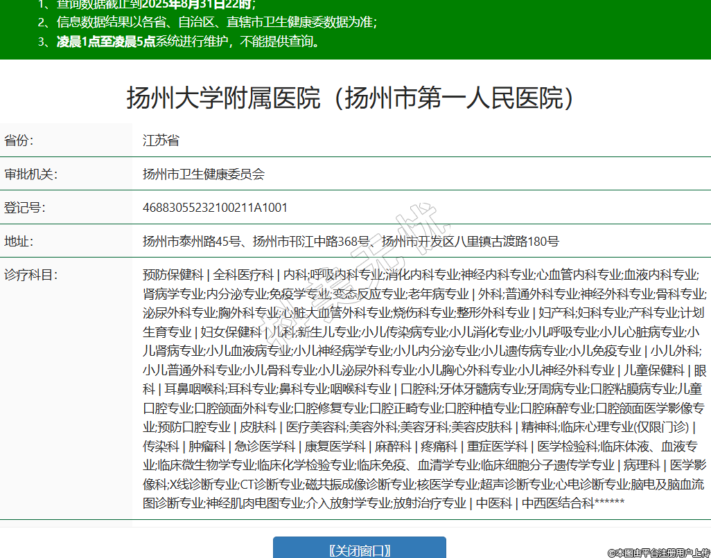 省份:江蘇省審批機(jī)關(guān):揚州市衛(wèi)生健康委員會登記號:46883055232100211A1001地址:揚州市泰州路45號、揚州市邗江中路368號、揚州市開發(fā)區(qū)八里鎮(zhèn)古渡路180號診療科目:預(yù)防保健科 | 全科醫(yī)療科 | 內(nèi)科;呼吸內(nèi)科專業(yè);消化內(nèi)科專業(yè);神經(jīng)內(nèi)科專業(yè);心血管內(nèi)科專業(yè);血液內(nèi)科專業(yè);腎病學(xué)專業(yè);內(nèi)分泌專業(yè);免疫學(xué)專業(yè);變態(tài)反應(yīng)專業(yè);老年病專業(yè) | 外科;普通外科專業(yè);神經(jīng)外科專業(yè);骨科專業(yè);泌尿外科專業(yè);胸外科專業(yè);心臟大血管外科專業(yè);燒傷科專業(yè);整形外科專業(yè) | 婦產(chǎn)科;婦科專業(yè);產(chǎn)科專業(yè);計劃生育專業(yè) | 婦女保健科 | 兒科;新生兒專業(yè);小兒傳染病專業(yè);小兒消化專業(yè);小兒呼吸專業(yè);小兒心臟病專業(yè);小兒腎病專業(yè);小兒血液病專業(yè);小兒神經(jīng)病學(xué)專業(yè);小兒內(nèi)分泌專業(yè);小兒遺傳病專業(yè);小兒免疫專業(yè) | 小兒外科;小兒普通外科專業(yè);小兒骨科專業(yè);小兒泌尿外科專業(yè);小兒胸心外科專業(yè);小兒神經(jīng)外科專業(yè) | 兒童保健科 | 眼科 | 耳鼻咽喉科;耳科專業(yè);鼻科專業(yè);咽喉科專業(yè) | 口腔科;牙體牙髓病專業(yè);牙周病專業(yè);口腔粘膜病專業(yè);兒童口腔專業(yè);口腔頜面外科專業(yè);口腔修復(fù)專業(yè);口腔正畸專業(yè);口腔種植專業(yè);口腔麻醉專業(yè);口腔頜面醫(yī)學(xué)影像專業(yè);預(yù)防口腔專業(yè) | 皮膚科 | 醫(yī)療美容科;美容外科;美容牙科;美容皮膚科 | 精神科;臨床心理專業(yè)(僅限門診) | 傳染科 | 腫瘤科 | 急診醫(yī)學(xué)科 | 康復(fù)醫(yī)學(xué)科 | 麻醉科 | 疼痛科 | 重癥醫(yī)學(xué)科 | 醫(yī)學(xué)檢驗科;臨床體液、血液專業(yè);臨床微生物學(xué)專業(yè);臨床化學(xué)檢驗專業(yè);臨床免疫、血清學(xué)專業(yè);臨床細(xì)胞分子遺傳學(xué)專業(yè) | 病理科 | 醫(yī)學(xué)影像科;X線診斷專業(yè);CT診斷專業(yè);磁共振成像診斷專業(yè);核醫(yī)學(xué)專業(yè);超聲診斷專業(yè);心電診斷專業(yè);腦電及腦血流圖診斷專業(yè);神經(jīng)肌肉電圖專業(yè);介入放射學(xué)專業(yè);放射治療專業(yè) | 中醫(yī)科 | 中西醫(yī)結(jié)合科******級別:三級法定代表人:龔開政主要負(fù)責(zé)人:龔開政執(zhí)業(yè)許可證有效期:2025/08/26 -至- 2036/01/24 -