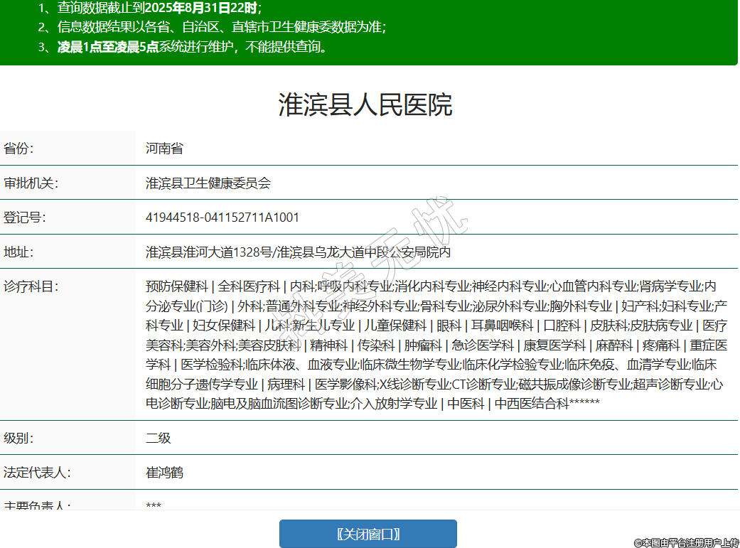 省份:河南省審批機(jī)關(guān):淮濱縣衛(wèi)生健康委員會(huì)登記號(hào):41944518-041152711A1001地址:淮濱縣淮河大道1328號(hào)/淮濱縣烏龍大道中段公安局院內(nèi)診療科目:預(yù)防保健科 | 全科醫(yī)療科 | 內(nèi)科;呼吸內(nèi)科專業(yè);消化內(nèi)科專業(yè);神經(jīng)內(nèi)科專業(yè);心血管內(nèi)科專業(yè);腎病學(xué)專業(yè);內(nèi)分泌專業(yè)(門診) | 外科;普通外科專業(yè);神經(jīng)外科專業(yè);骨科專業(yè);泌尿外科專業(yè);胸外科專業(yè) | 婦產(chǎn)科;婦科專業(yè);產(chǎn)科專業(yè) | 婦女保健科 | 兒科;新生兒專業(yè) | 兒童保健科 | 眼科 | 耳鼻咽喉科 | 口腔科 | 皮膚科;皮膚病專業(yè) | 醫(yī)療美容科;美容外科;美容皮膚科 | 精神科 | 傳染科 | 腫瘤科 | 急診醫(yī)學(xué)科 | 康復(fù)醫(yī)學(xué)科 | 麻醉科 | 疼痛科 | 重癥醫(yī)學(xué)科 | 醫(yī)學(xué)檢驗(yàn)科;臨床體液、血液專業(yè);臨床微生物學(xué)專業(yè);臨床化學(xué)檢驗(yàn)專業(yè);臨床免疫、血清學(xué)專業(yè);臨床細(xì)胞分子遺傳學(xué)專業(yè) | 病理科 | 醫(yī)學(xué)影像科;X線診斷專業(yè);CT診斷專業(yè);磁共振成像診斷專業(yè);超聲診斷專業(yè);心電診斷專業(yè);腦電及腦血流圖診斷專業(yè);介入放射學(xué)專業(yè) | 中醫(yī)科 | 中西醫(yī)結(jié)合科******級(jí)別:二級(jí)法定代表人:崔鴻鶴主要負(fù)責(zé)人:***執(zhí)業(yè)許可證有效期:2024/02/20 -至- 2030/05/15 -
